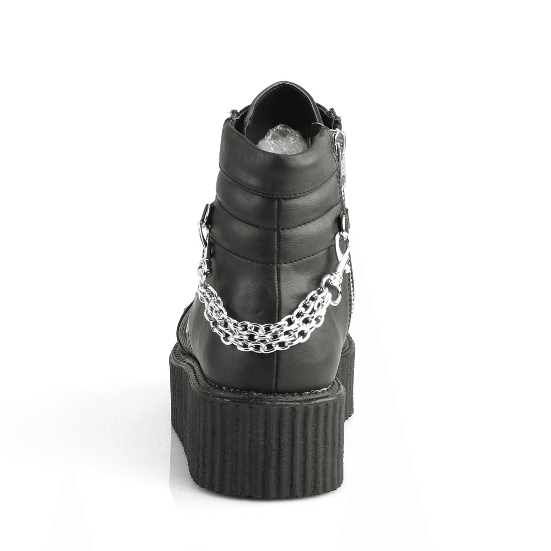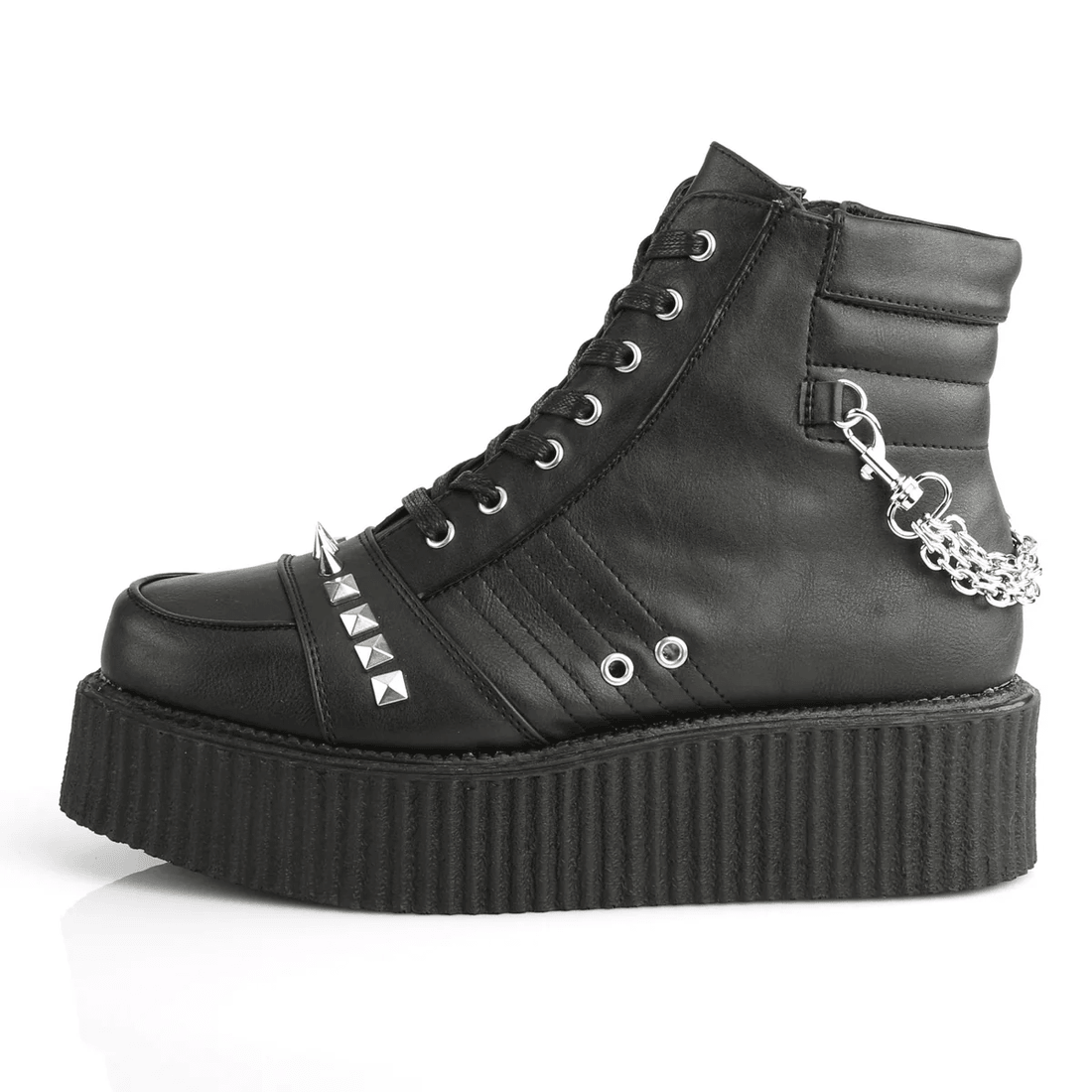 ادخل إلى عالم من الأسلوب الجريء مع demonia Cult V-creeper-565 الأسود من الجلد النباتي. مصممة لعشاق الموضة الجريئين، هذه الأحذية هي قطعة البيان النهائية، تجمع بين الجمالية الجريئة والمواد الأخلاقية.