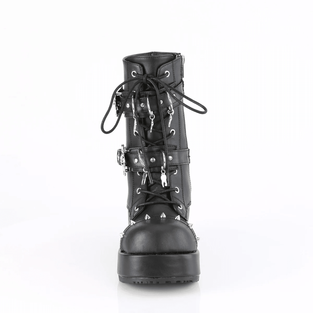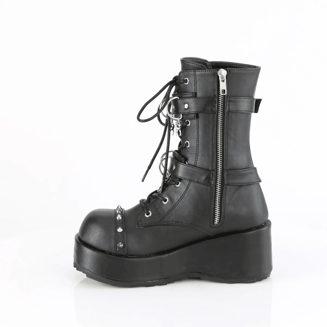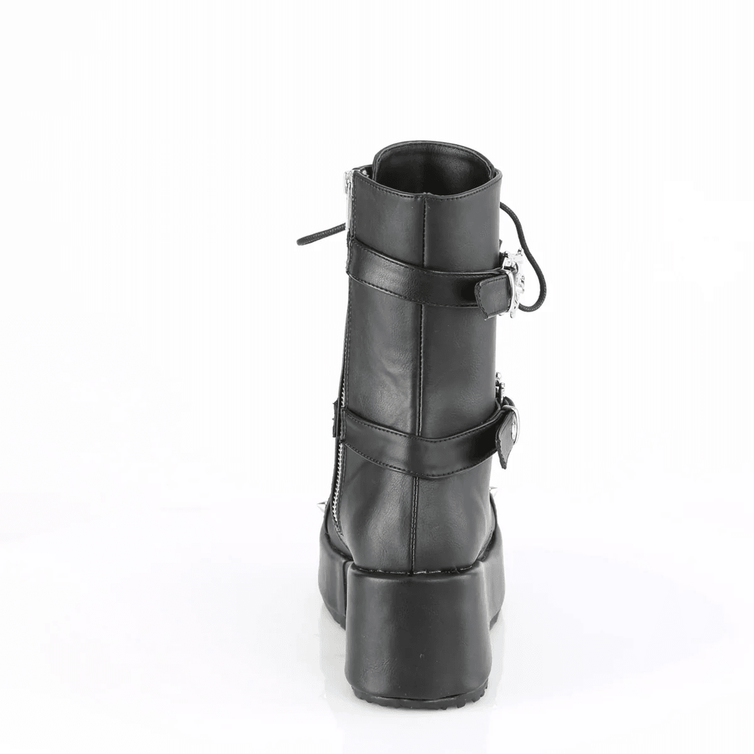 девония култ куби-54 е перфектната комбинация от комфорт и остър стил. изработени от гладка черна веганска кожа, тези универсални ботуши са идеални за всякакъв повод. платформата от 2 3/4" осигурява точното количество височина, докато дизайнът с връзки гарантира сигурно прилягане. забележителните двойни катарами с черепи и шипове добавят ярък акцент, правейки тези ботуши отличен избор за вашия гардероб.