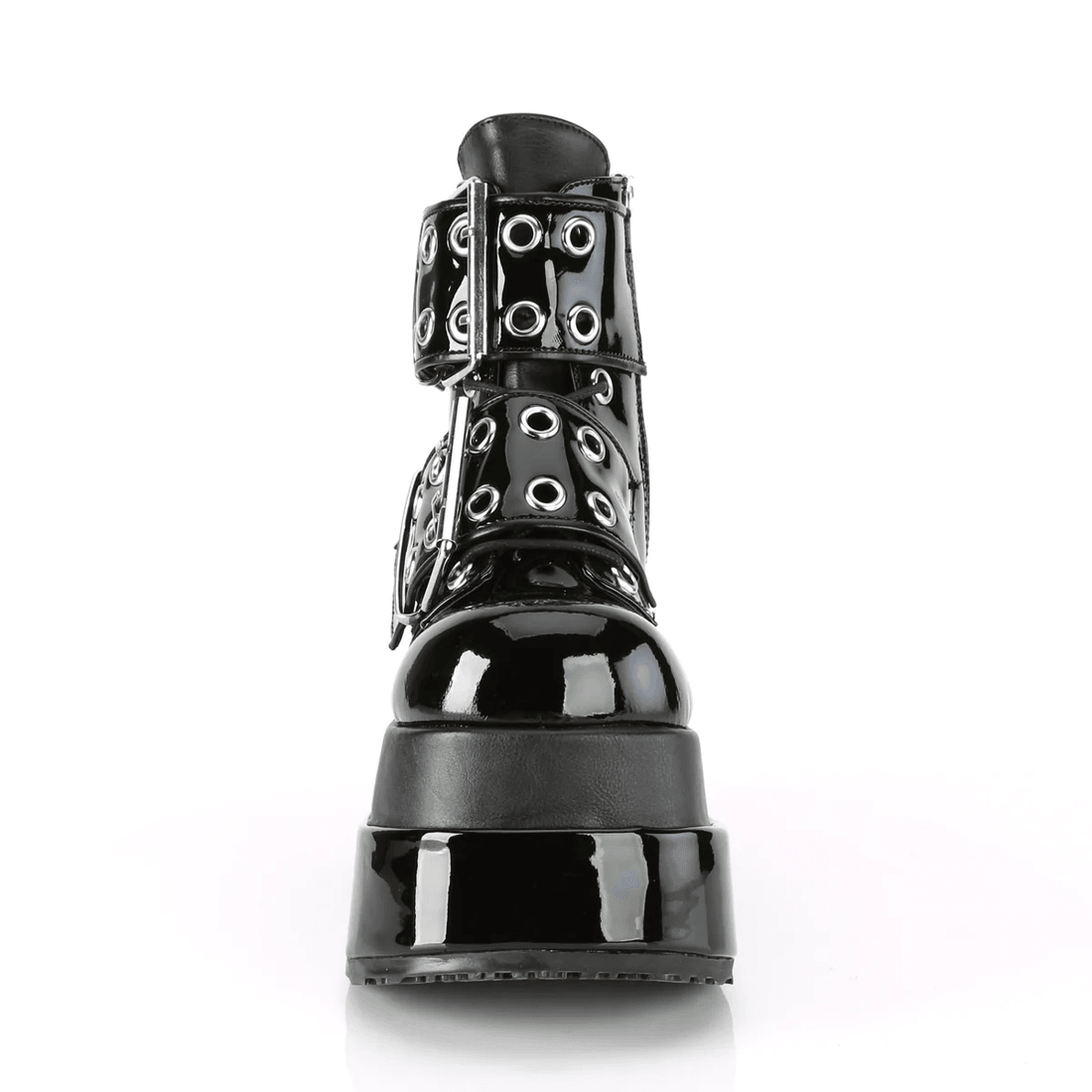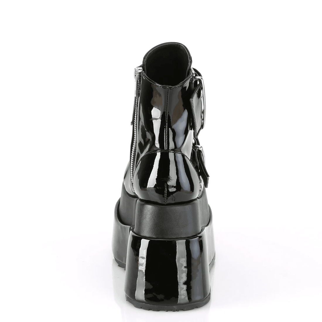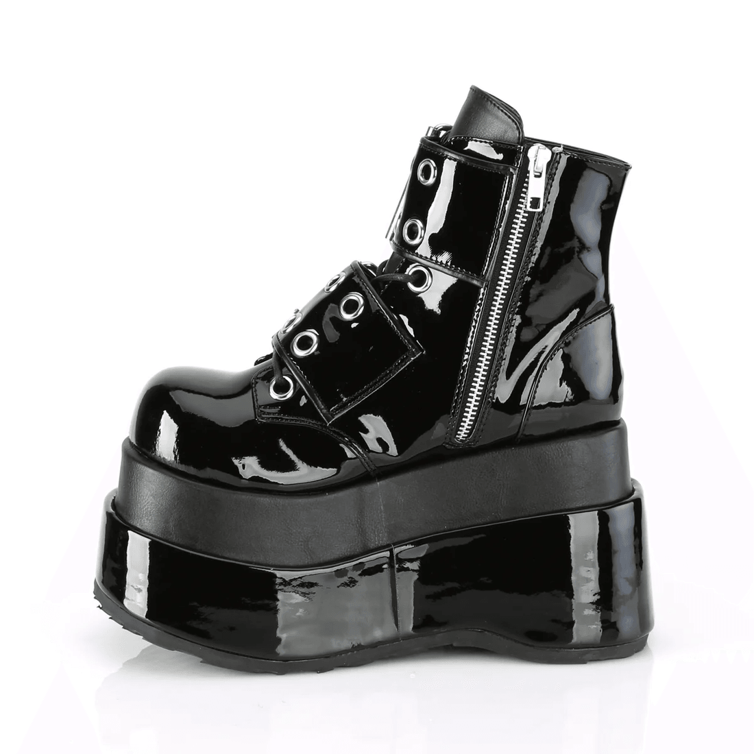 Step into the spotlight with the Demonia Cult Bear-104 Black Patent-Vegan Leather ankle boots. These striking boots are designed for those who dare to express their bold style. With a stylish 4 1/2" tiered platform and eye-catching lace-up front, the Bear-104 boots are your ultimate footwear statement.