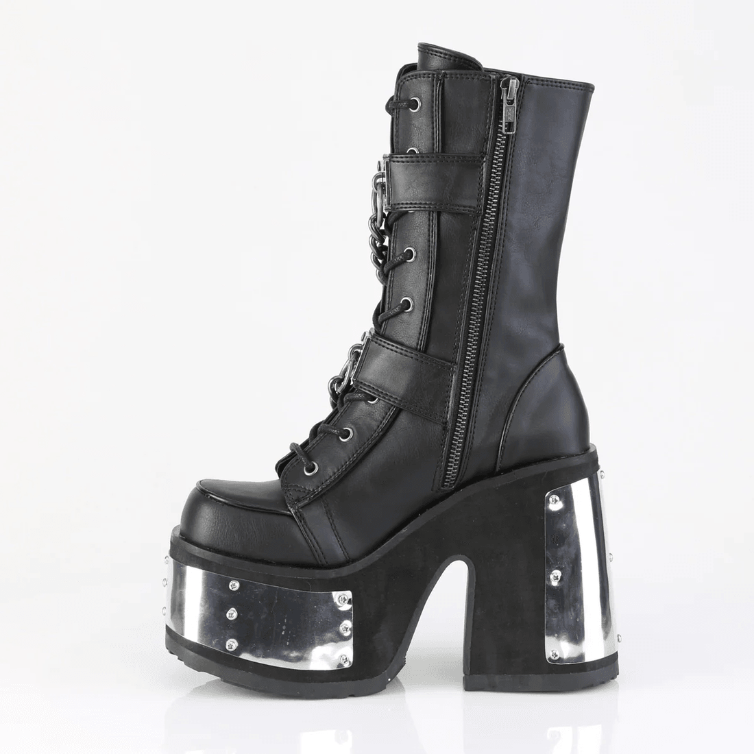 Don't miss out on making a bold fashion statement. Grab your pair of Demonia Cult Camel-120 Black Vegan Leather Boots today and step up your style game!