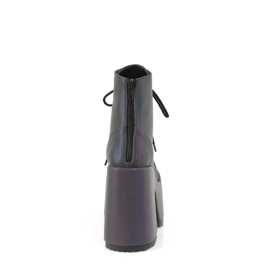 Make a bold statement wherever you go with the Demonia Cult Camel-203 Green Multi Reflective ankle boots. Designed for the fearless fashionista, these striking boots combine edgy style with comfort and functionality.