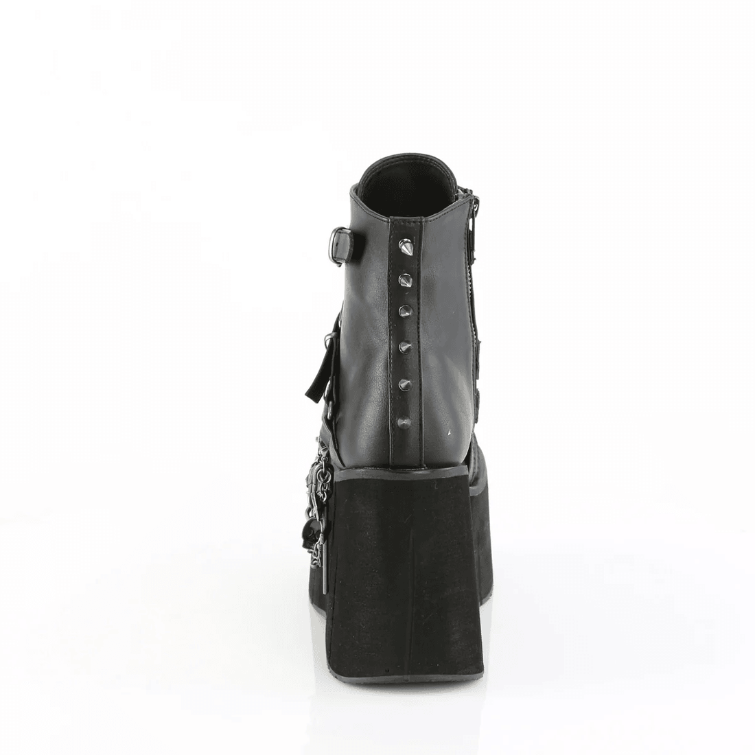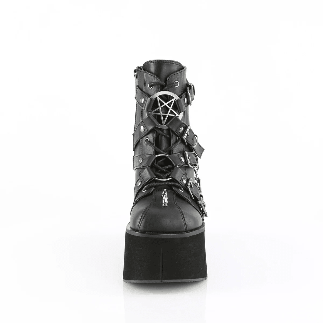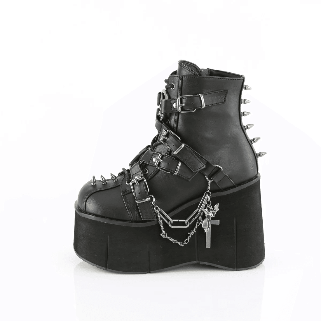 Introducing the Demonia Cult Kera-68 Black Vegan Leather ankle boots, where edgy meets elegance. Designed for those who want to make a bold statement, these boots elevate your outfit with a striking 4.5" platform. Perfect for any occasion, they are the ultimate blend of style and comfort.