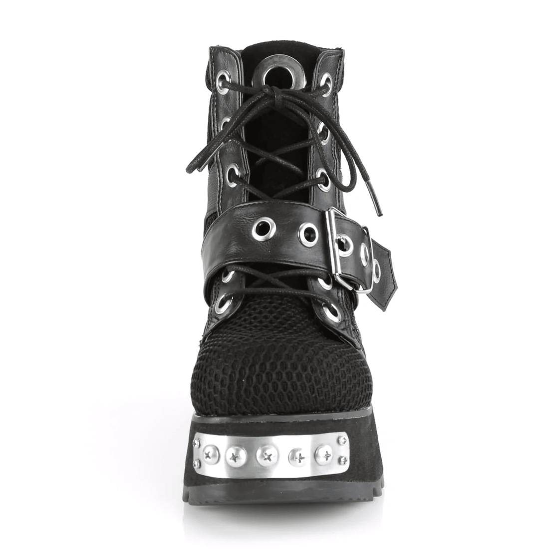 Demonia Cult Scene-53 Black Vegan Leather-Fishnet Fabric Ankle Boots