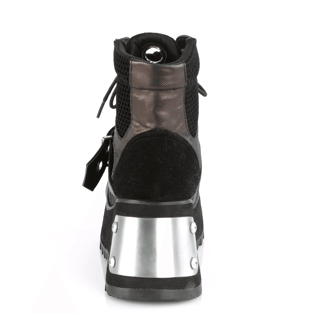 Step into boldness with the Demonia Cult Scene-53 Black Vegan Leather-Fishnet Fabric ankle boots. These striking lace-up boots are designed for those who dare to make a statement. With a 3.5" metal-plated platform, these boots elevate your style and confidence in any setting.