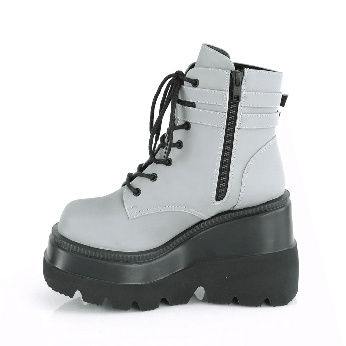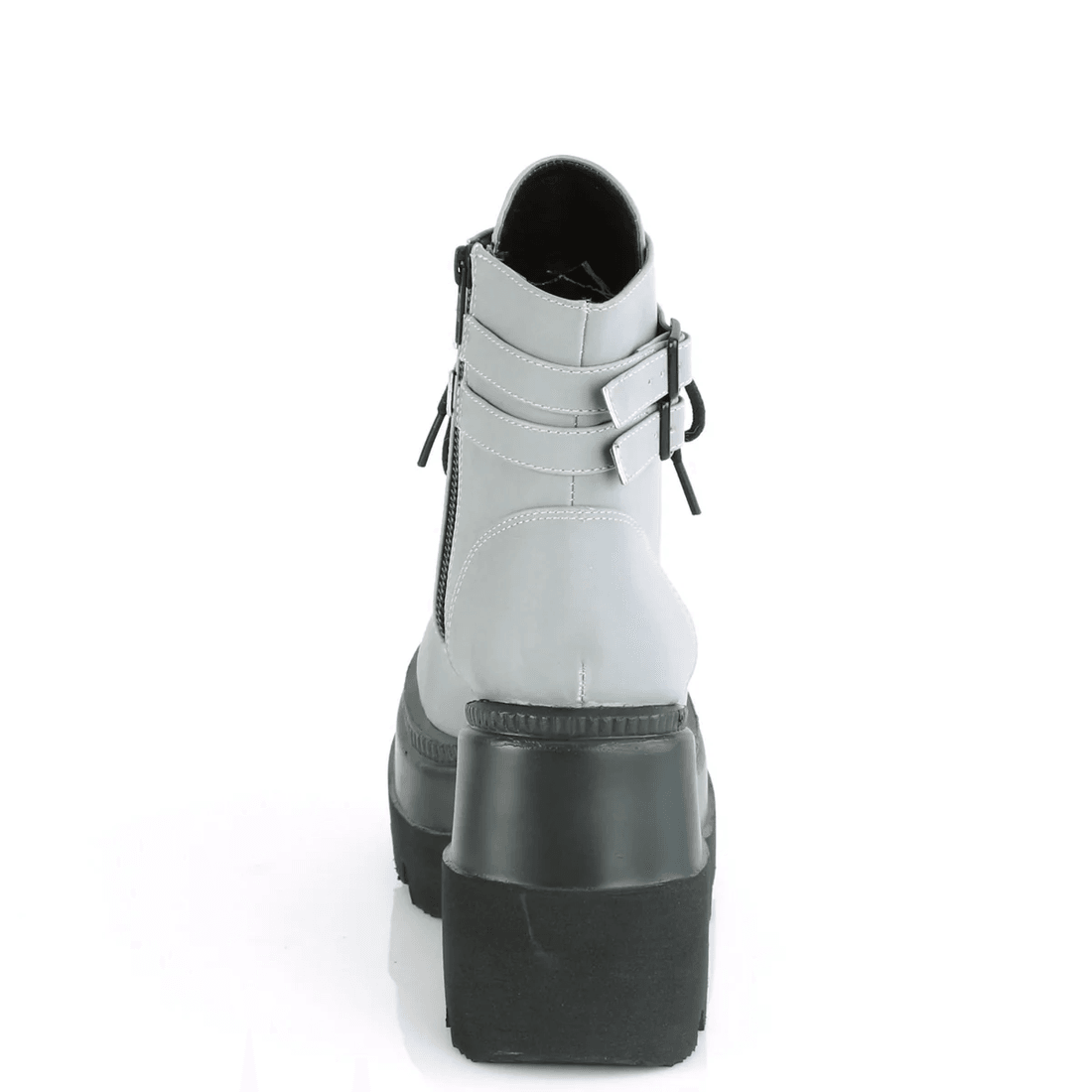 Elevate your alternative fashion game with the Demonia Cult Shaker-52 Gray Reflective ankle boots. These striking boots combine edgy style with comfort, making them perfect for those who embrace a goth, punk, or alternative look. With a commanding 4 1/2" wedge platform, you'll not only gain height but also make a bold statement wherever you go.