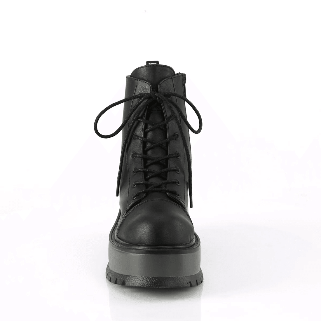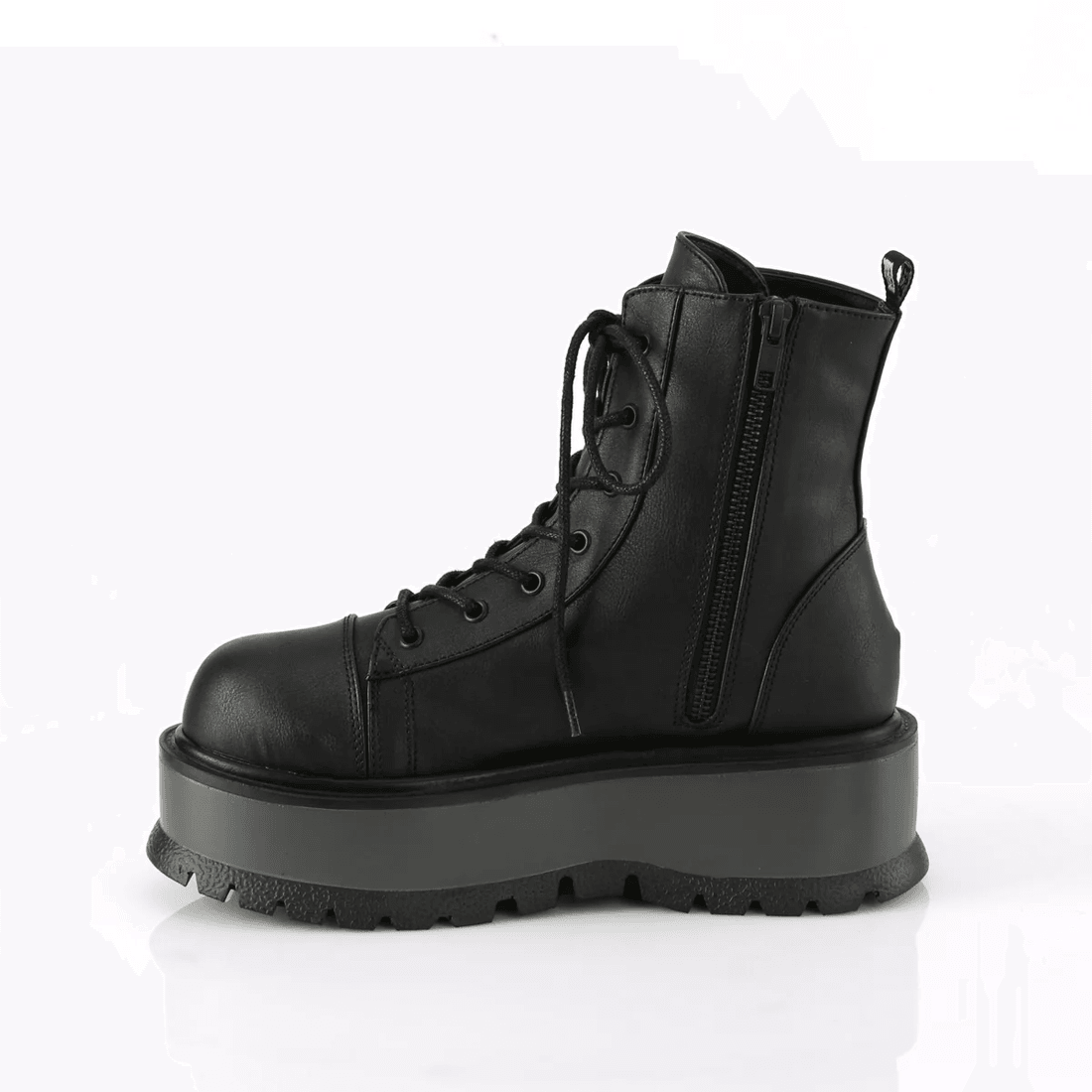 The Demonia Cult Slacker-55 Black Vegan Leather ankle boots feature a stylish 2" platform that elevates your look while ensuring comfort throughout the day. The lace-up design allows for a tailored fit, while the inside metal zip closure provides convenience, making it simple to slip them on and off. With an approximate calf circumference of 9.7" and a shaft height of 5.5", these boots are versatile enough to wear with any outfit.