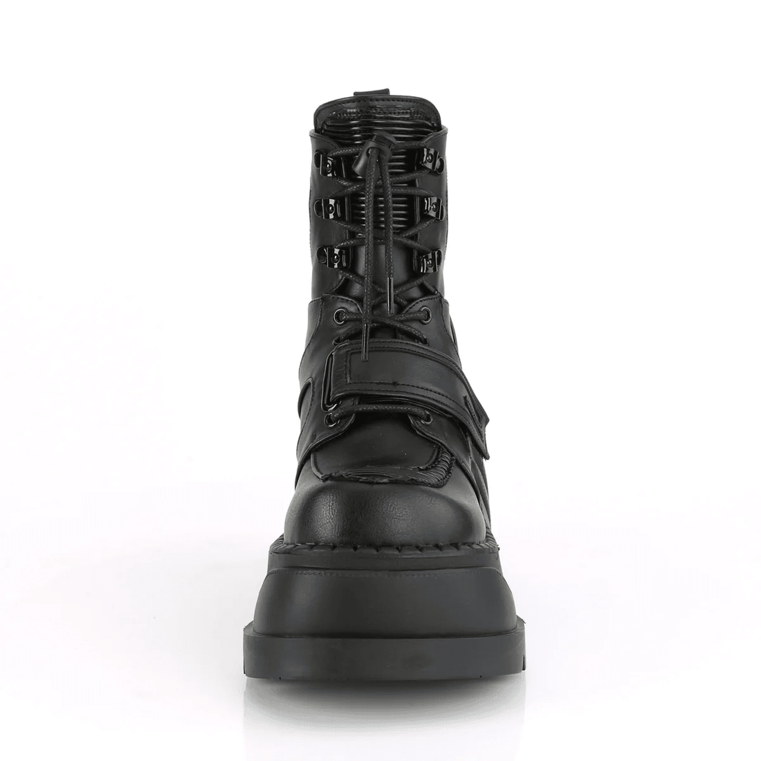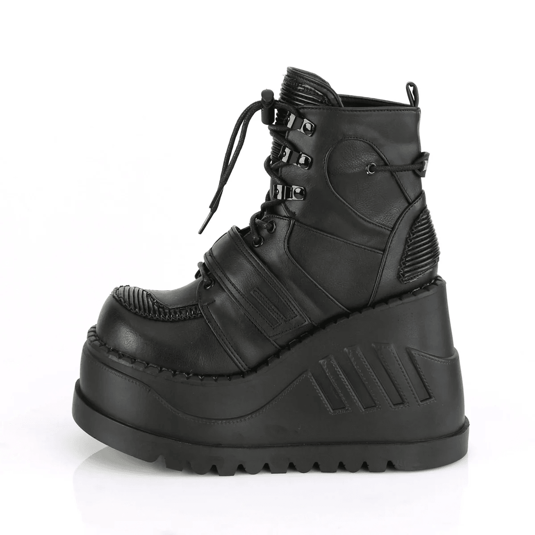 The Demonia Cult Stomp-13 boots redefine edgy fashion. Crafted from premium black vegan leather, these ankle boots are perfect for those who want to make a statement without compromising their ethics. The impressive 4 3/4" wedge platform not only elevates your height but also enhances your confidence.
