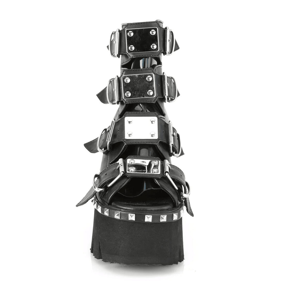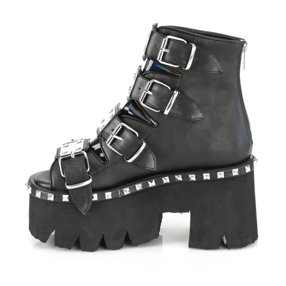 Demonia Cult Ashes-70 Black Vegan Leather & Hologram Bootie Sandal