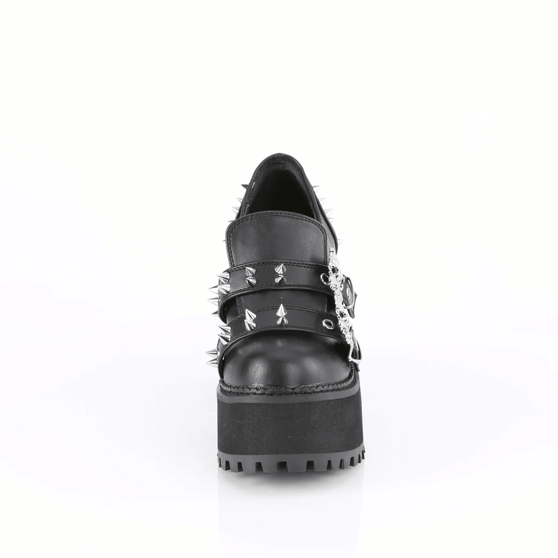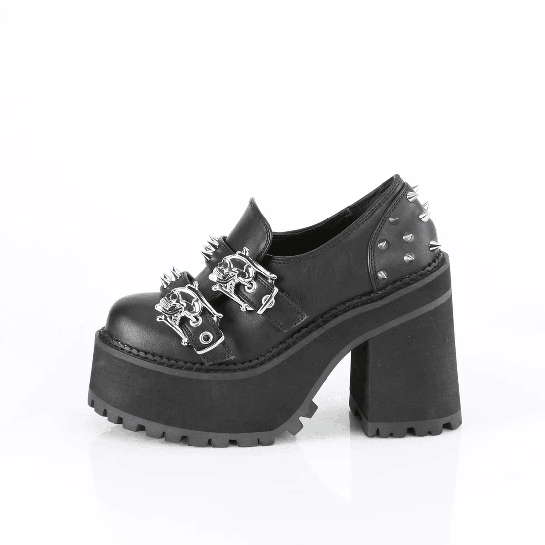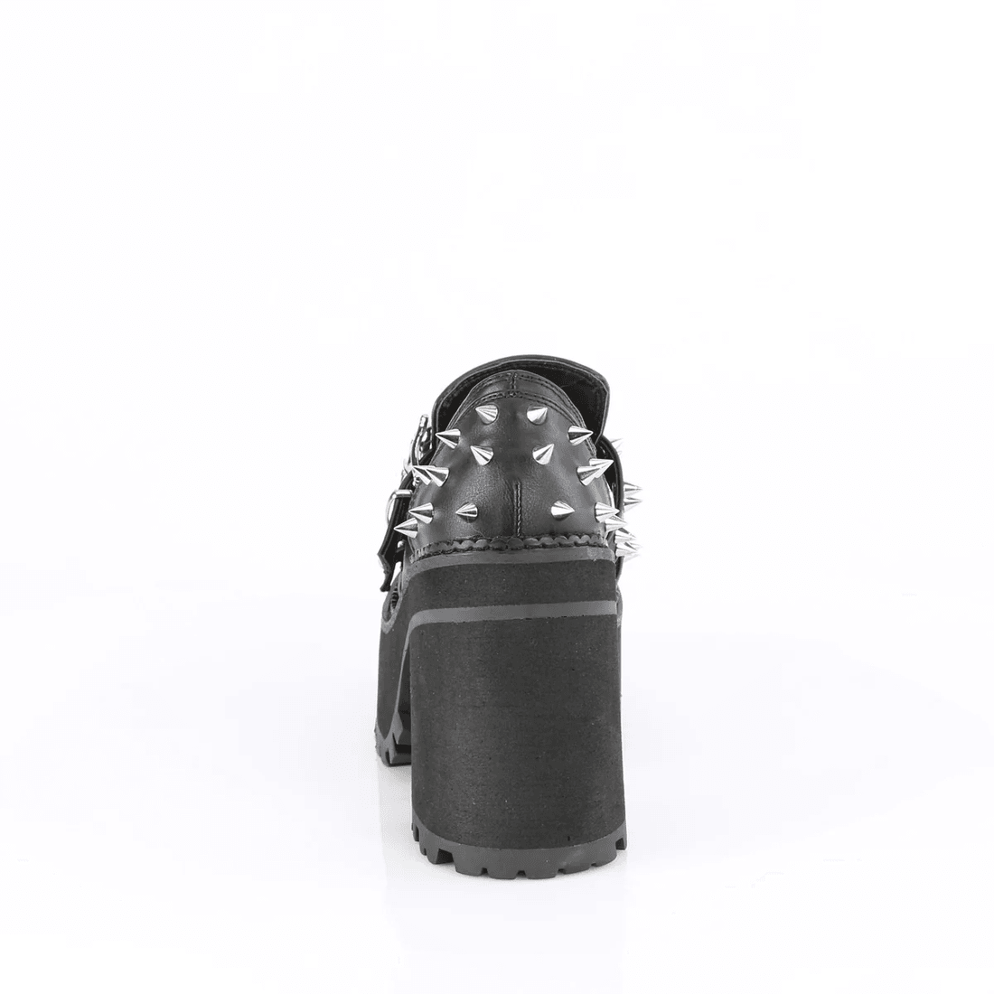 The Demonia Cult Assault-38 Black Vegan Leather is the perfect blend of style and attitude. Its chunky block heel combined with a cleated platform provides the ideal balance of height and support, making it suitable for both day and night wear. The double skull buckle straps and cone spike stud details add a fearless touch, ensuring you turn heads wherever you go.
