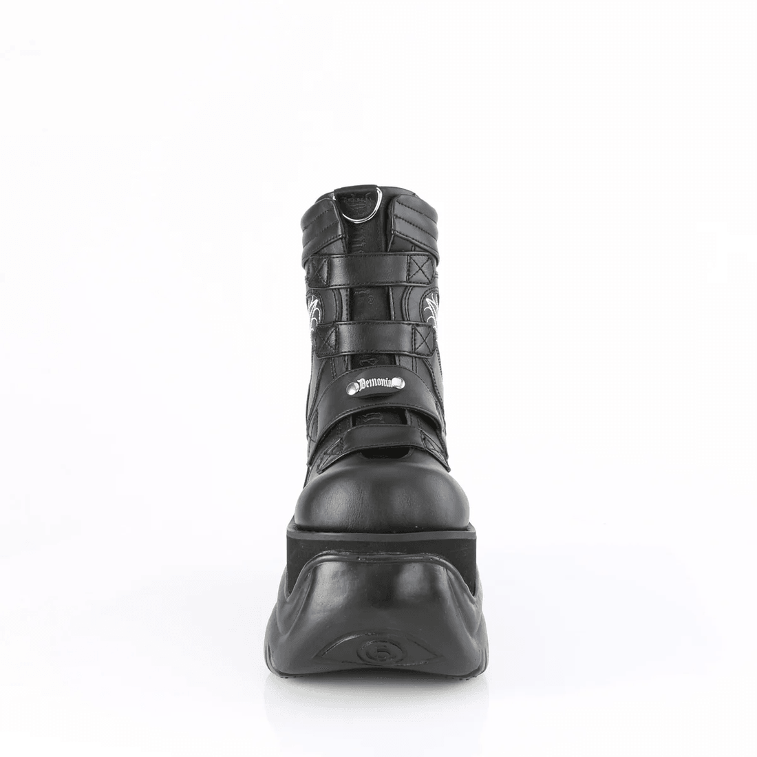 The Demonia Cult Boxer-70 ankle boots are crafted from high-quality black vegan leather, making them a stylish and eco-friendly choice. The striking ornamental front straps and spider web embroidered side panels provide a captivating visual appeal that’s perfect for any occasion. Whether you're pairing them with jeans for a casual day out or a skirt for a night on the town, these boots offer versatility and flair.