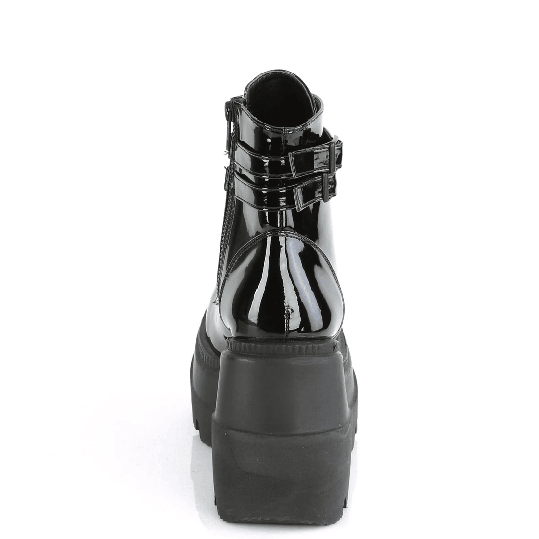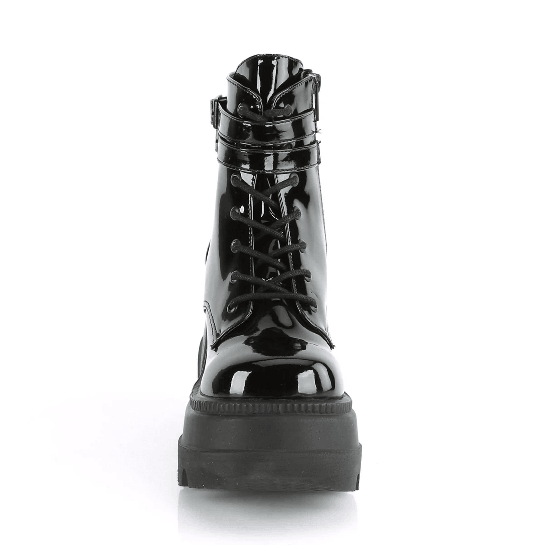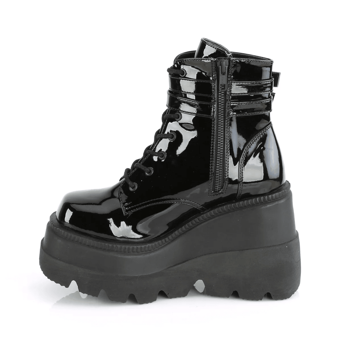 Step out in bold confidence with the Demonia Cult Shaker-52 Black Patent ankle boots. These striking boots feature a commanding 4 1/2" wedge platform that makes a statement wherever you go. Perfect for the alternative fashion enthusiast, they combine edgy design with unparalleled comfort.