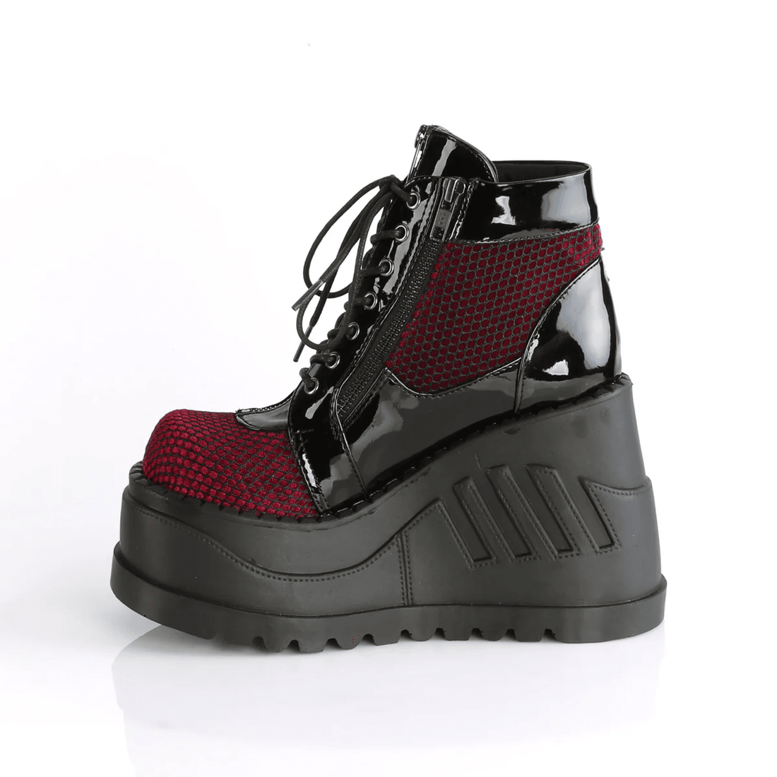 Unleash your bold style with the stunning Demonia Cult Stomp-18 Black Patent-Burgundy Velvet booties. Designed for the fearless fashionista, these avant-garde booties elevate your look with a striking 4 3/4" platform and unique design elements.
