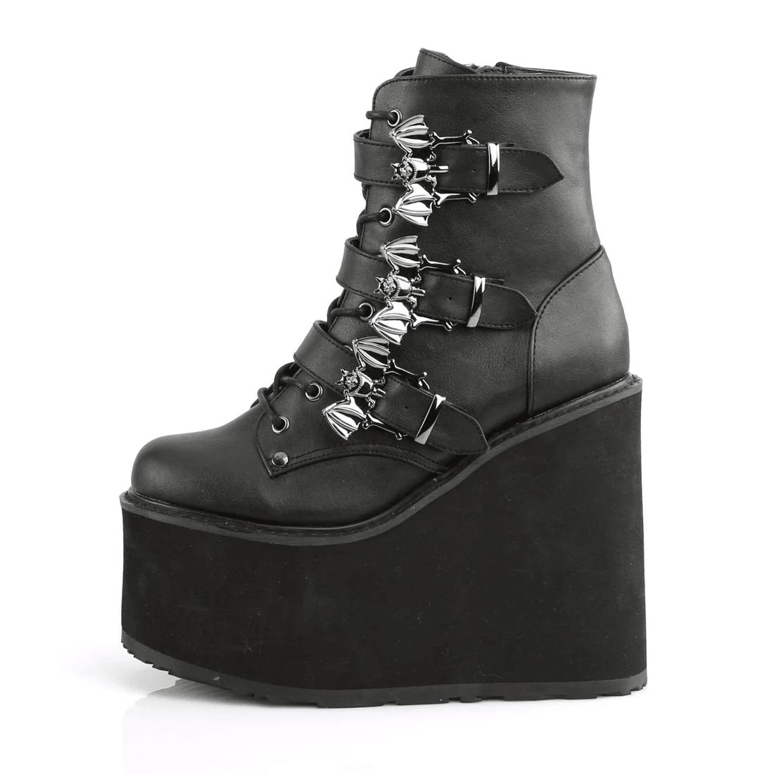 The Demonia Cult Swing-103 ankle boots are designed for those who embrace their individuality. With a bold wedge platform height of 5 1/2 inches, these boots provide both elevation and comfort. The lace-up front ensures a snug fit, while the metal inside zip closure offers convenience. The unique triple bat buckle straps not only enhance the design but also reflect your alternative style.