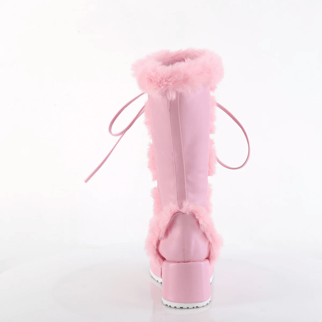 Crafted for the bold at heart, the Demonia Cult Cubby-311 boots feature a striking 2 3/4" platform that combines style with comfort. Wrapped in luxurious baby pink vegan leather, these boots are not just footwear; they are a fashion statement. The soft faux fur trim adds an extra layer of sophistication, making them ideal for chilly evenings out or simply elevating your everyday look.