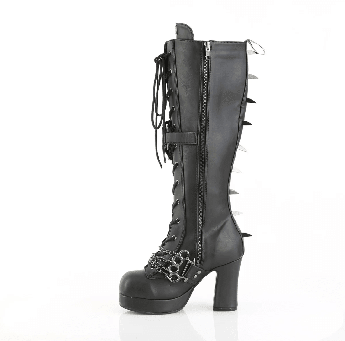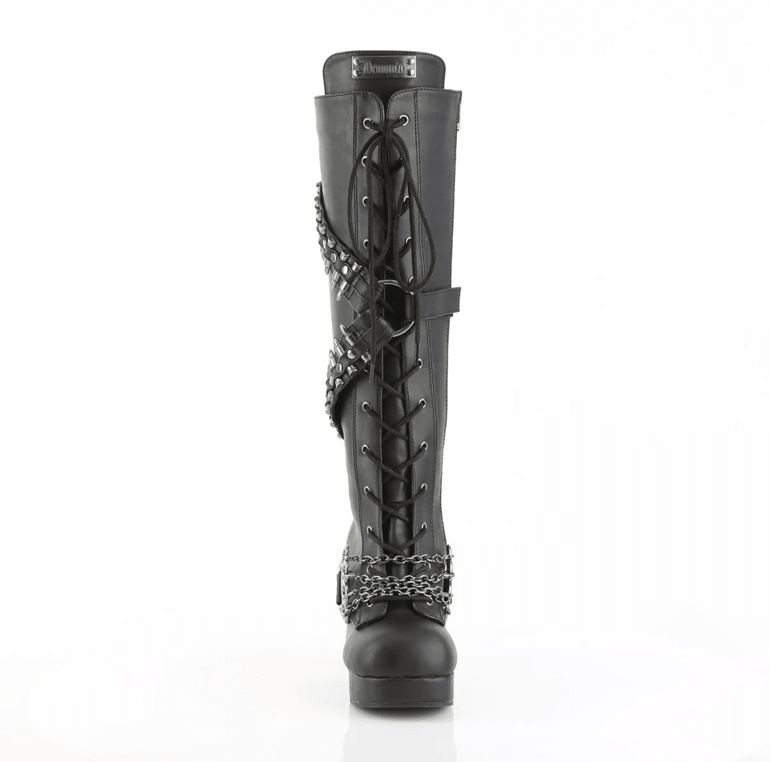 Elevate your gothic style with the Demonia Cult Gothika-108 Black Vegan Leather boots. Designed for those who dare to stand out, these striking knee-high boots blend edgy aesthetics with comfort and functionality.