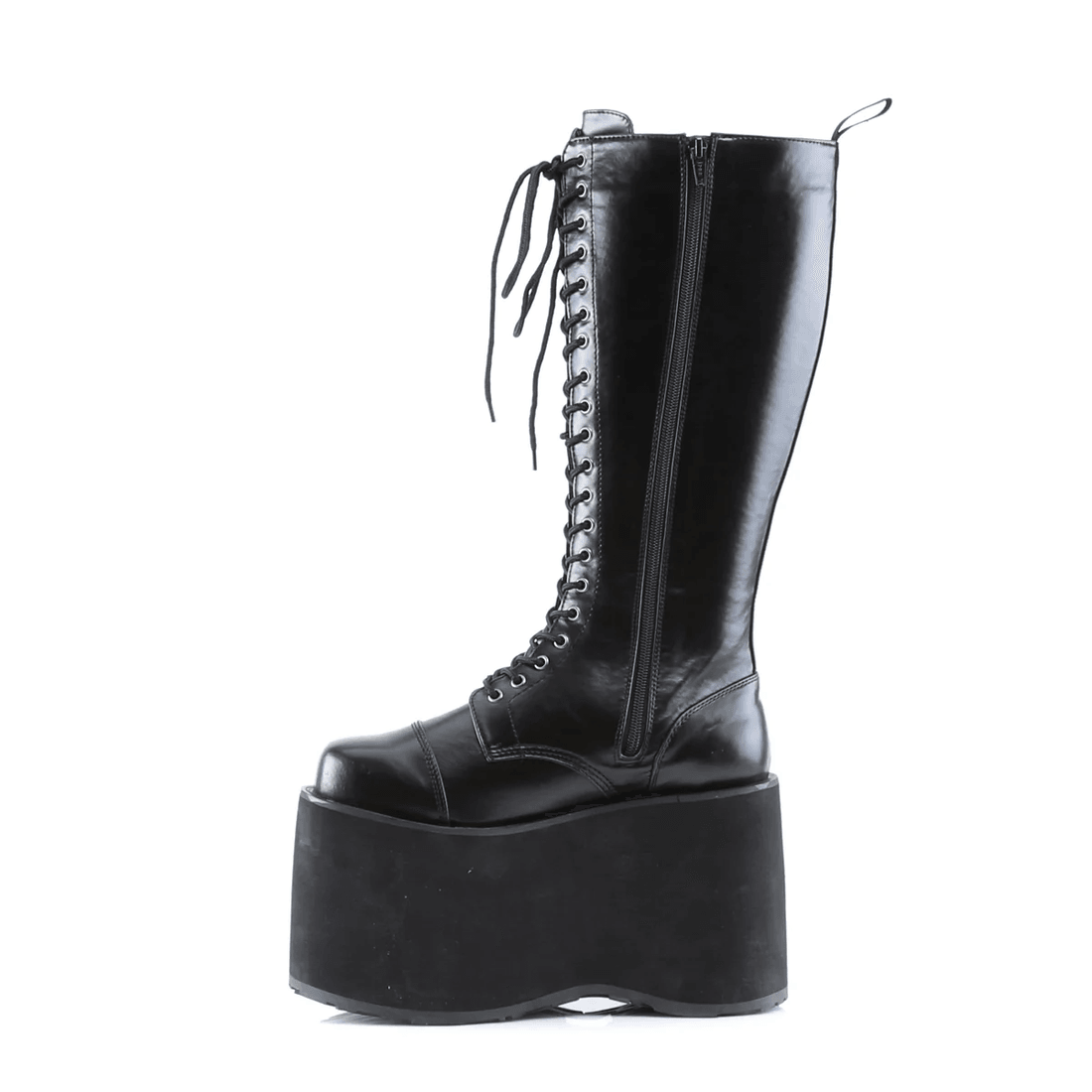 Elevate your footwear game with the Demonia Cult Mega-602 Black Faux Leather boots. Perfect for goth, punk, and cyber enthusiasts, these stunning knee-high boots combine edgy design with unparalleled comfort. With a towering 5 3/4" platform, these boots are crafted to make a bold statement.
