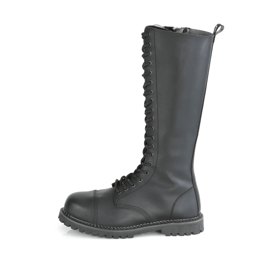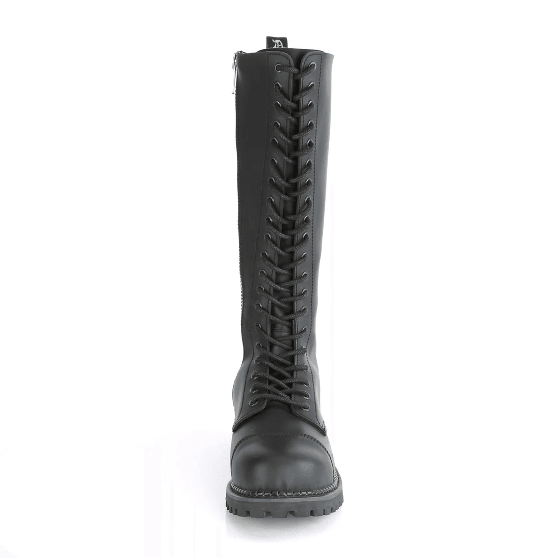 Introducing the Demonia Cult Riot-20 Black Vegan Leather boots, where bold fashion meets uncompromising durability. These knee-high boots redefine edgy sophistication with their striking 20-eyelet lace-up design, making them a must-have for anyone looking to make a powerful statement.