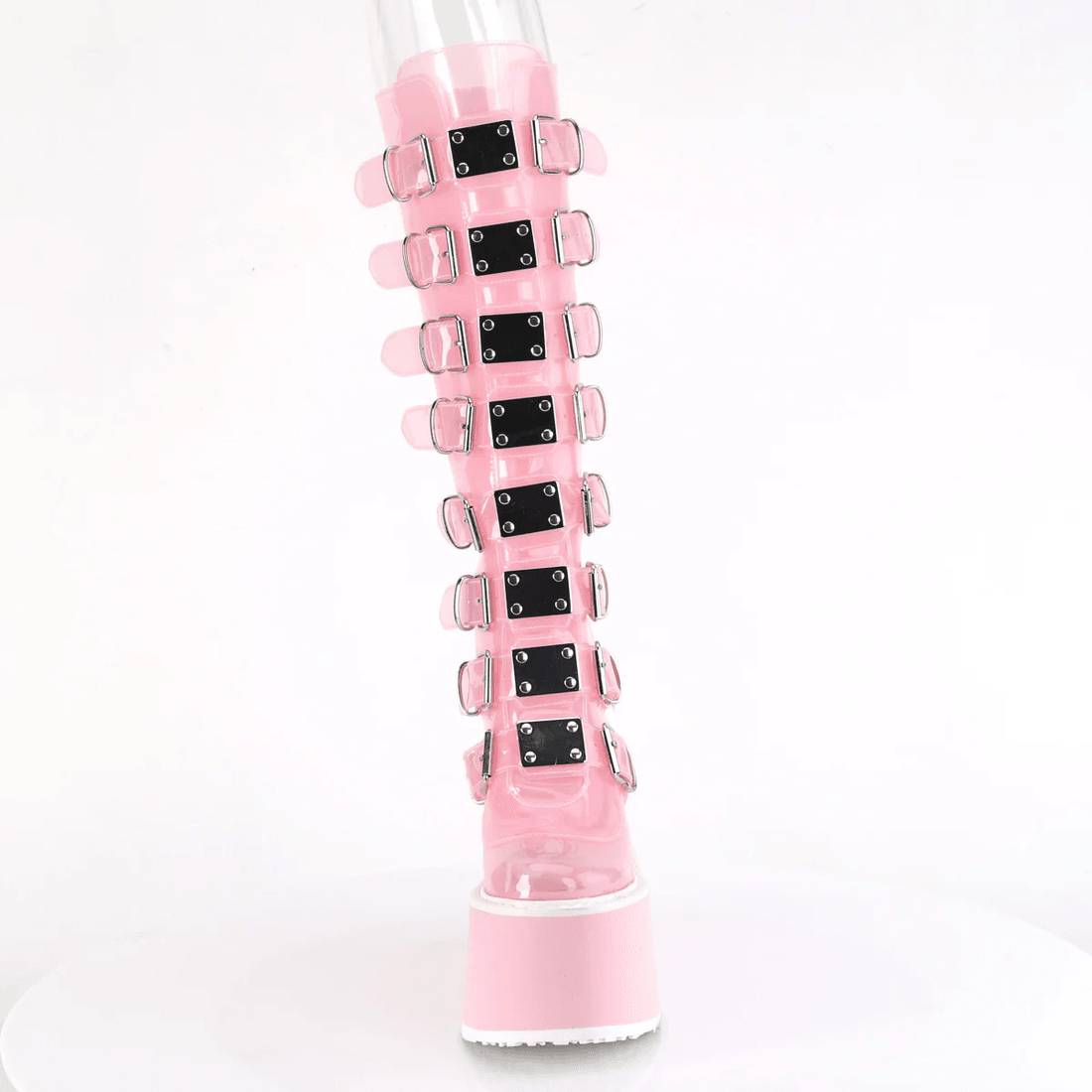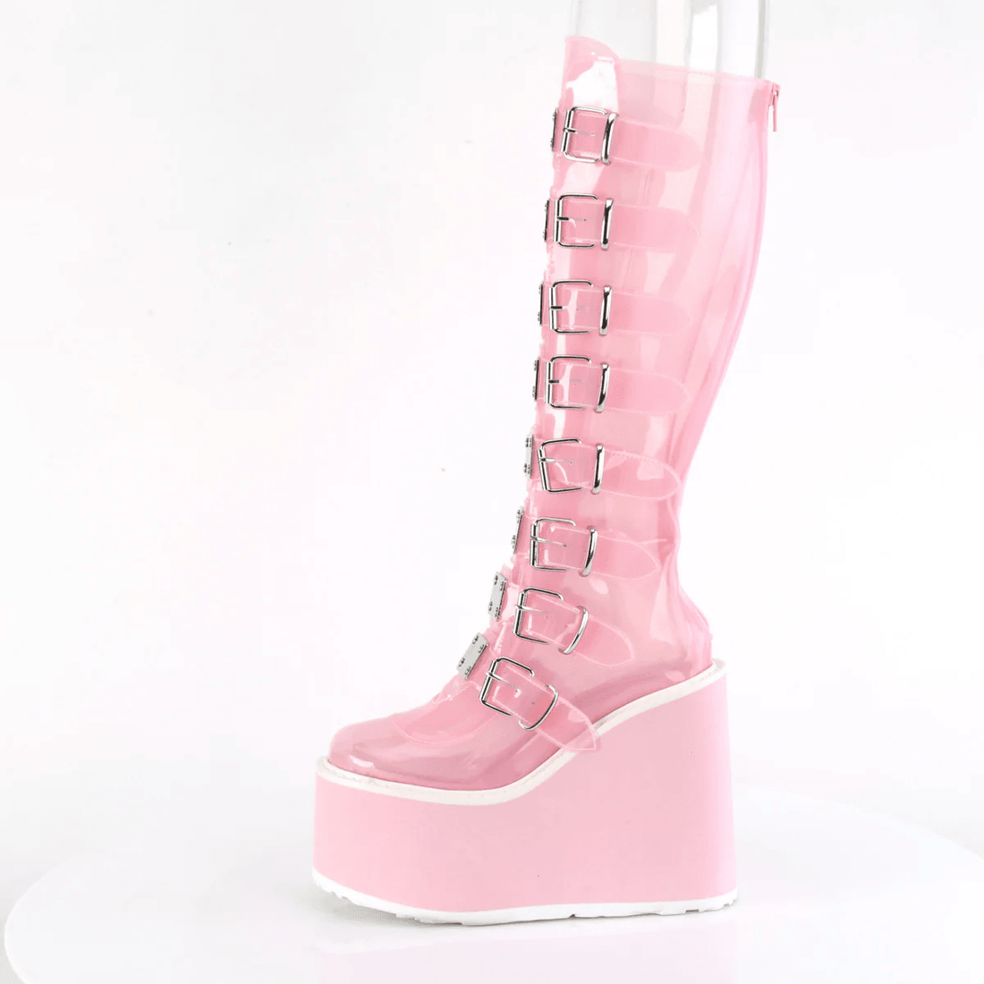 Elevate your footwear collection with the Demonia Cult Swing-815C Baby Pink TPU, a striking knee-high boot designed to turn heads. This trendy boot offers a perfect blend of fierce fashion and playful charm, making it an essential addition for style-savvy individuals.