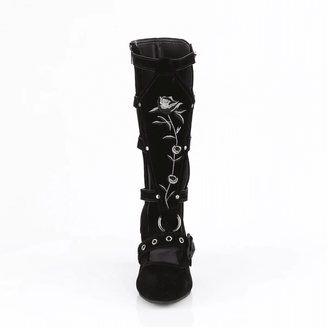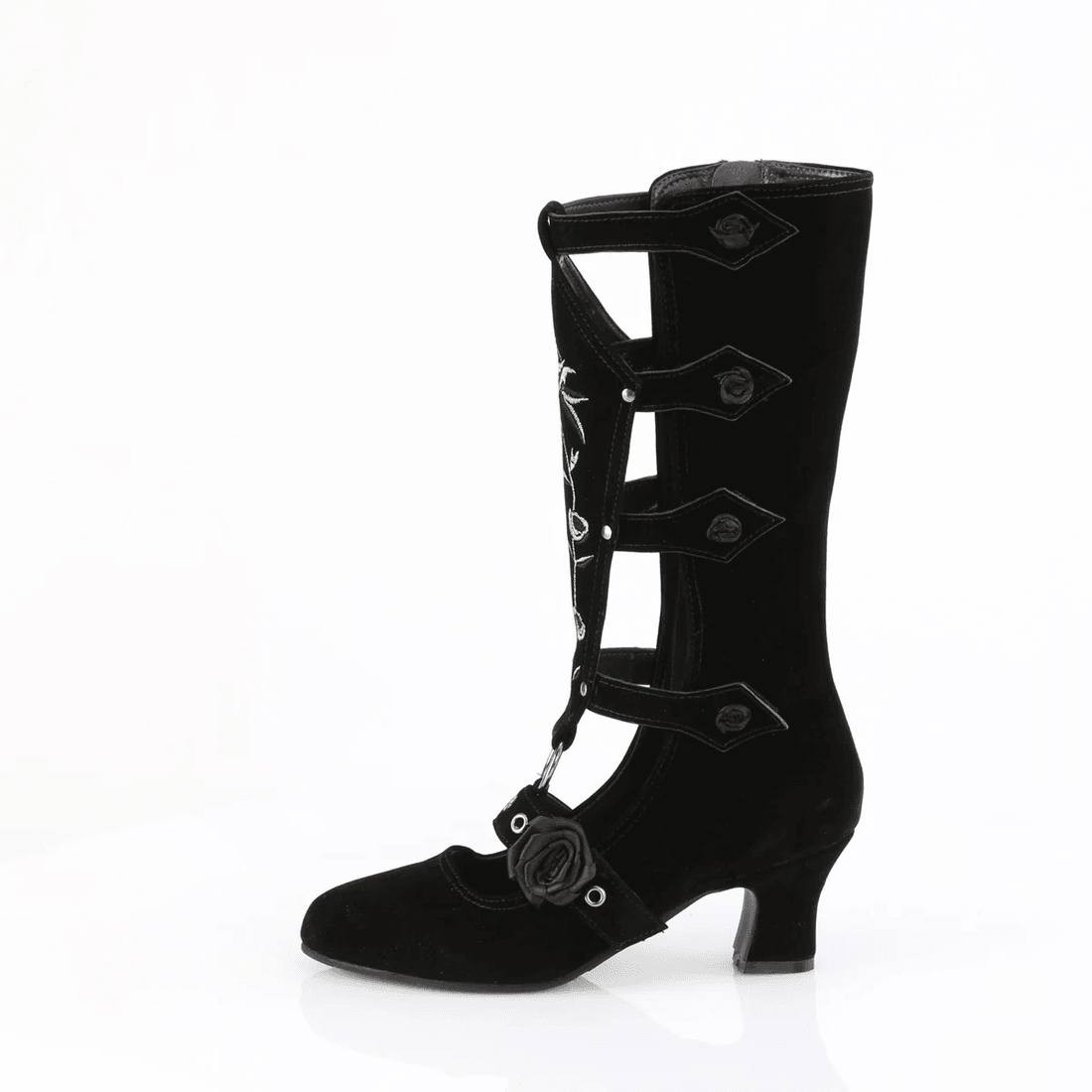 What sets these boots apart is the captivating combination of a coffin-shaped shield and delicate embroidery. The tiny rose buttons add a whimsical touch, striking a perfect balance between elegance and a hint of darkness. Whether you’re dressing up for a night out or adding flair to your everyday outfit, these boots are sure to turn heads.