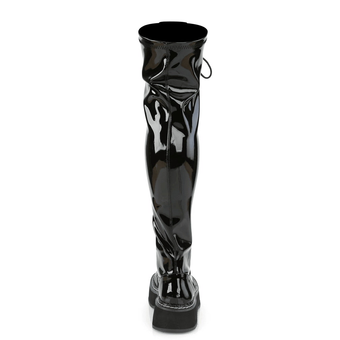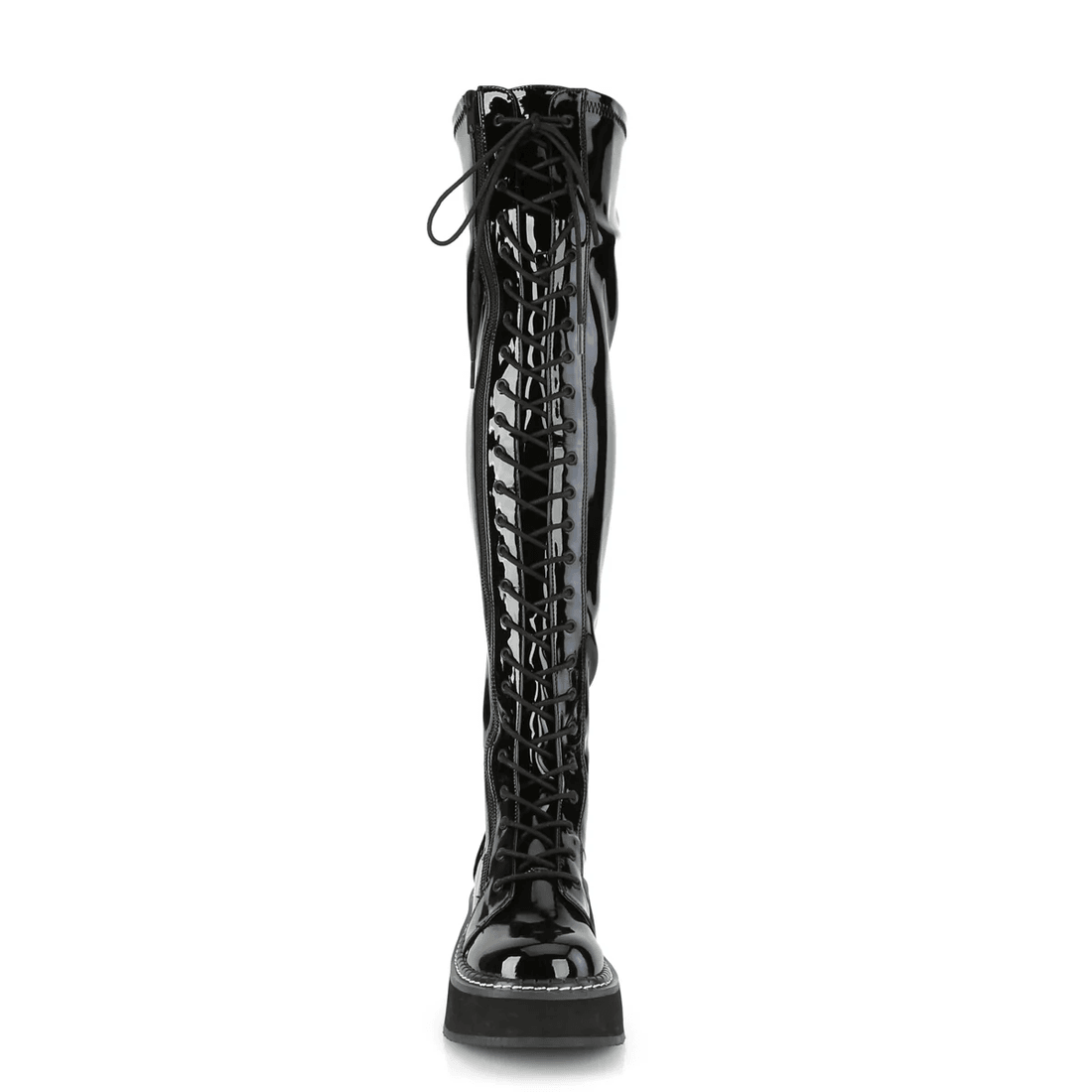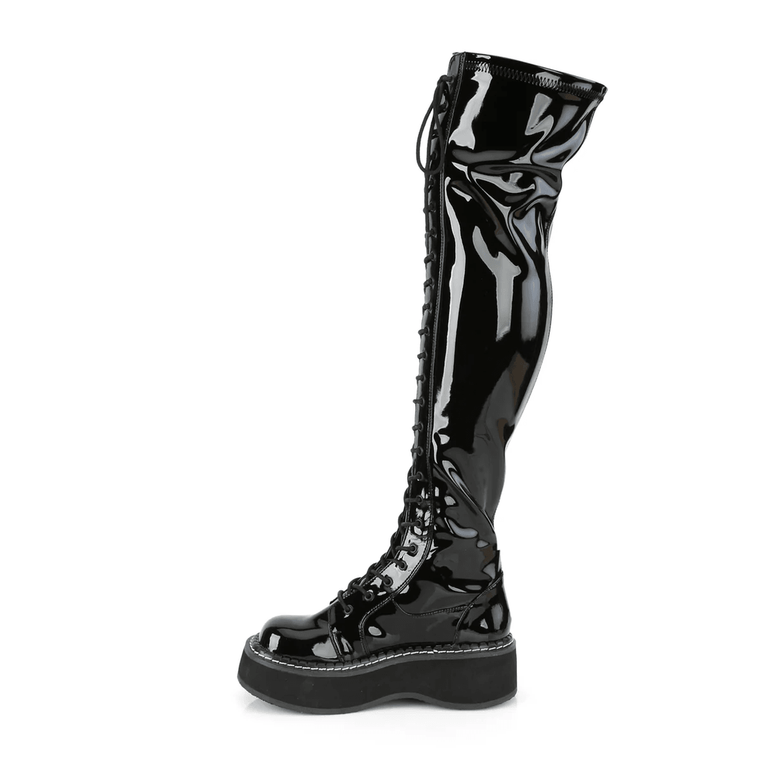 The Demonia Cult Emily-375 Black Patent boots are designed for those who dare to stand out. The mirrored shine of the high-quality black patent leather will turn heads wherever you go. With a sleek lace-up front, these thigh-high boots not only elevate your look but also provide a secure fit that flatters your legs.