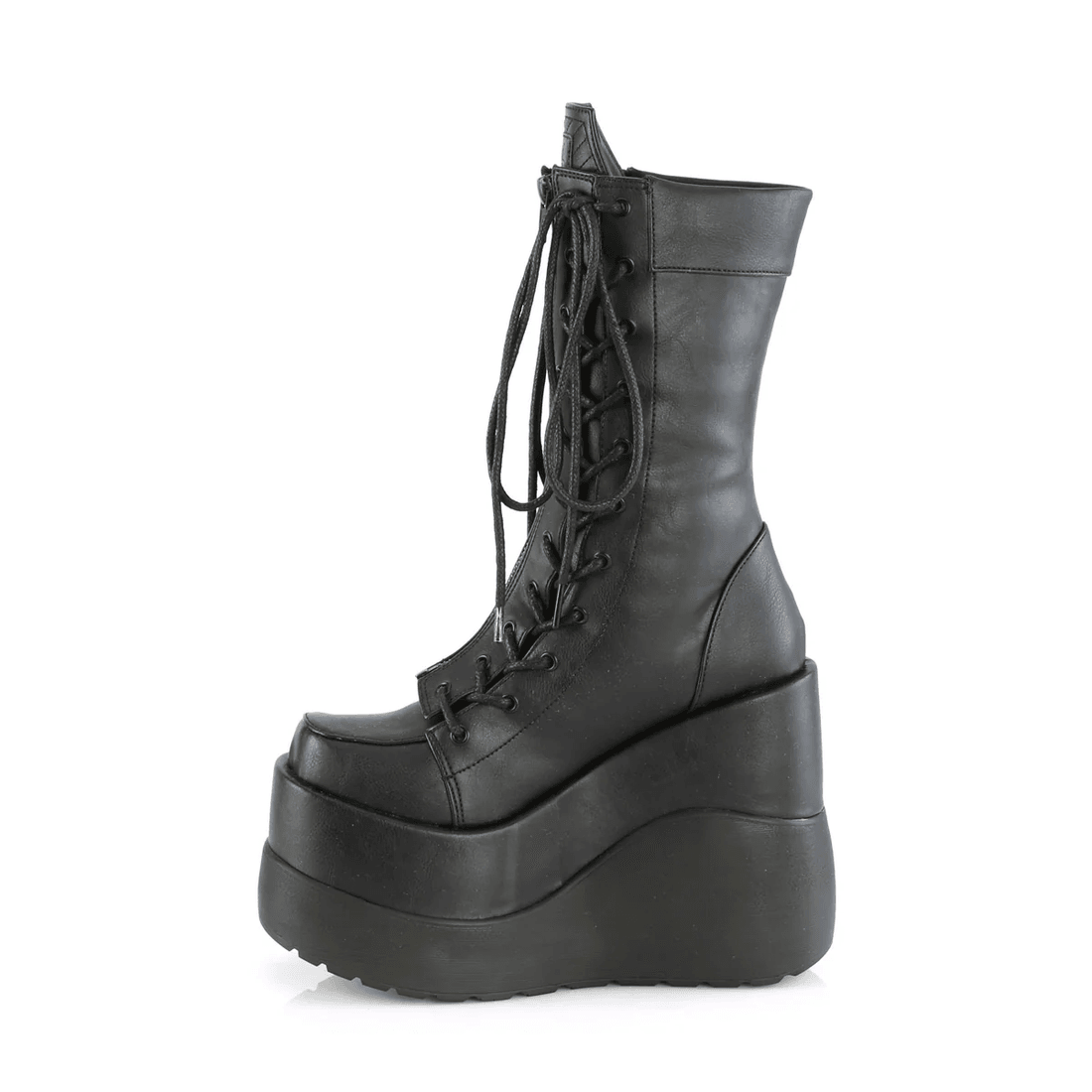 pozvedněte Svou Obuv Na Novou úroveň S demonia Cult Void-118 černými Veganskými Koženými Lakovými Botami Do Poloviny Lýtek. Tyto Nápadné Boty Kombinují Odvážnou Estetiku S Závazkem K Udržitelnosti, Což Z Nich činí Nezbytnost Pro Módně Uvědomělé Jedince.