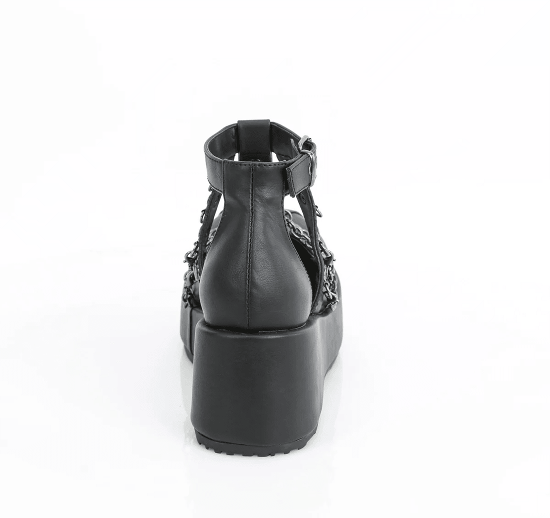 Step into style with the Demonia Cult Cubby-28 Black Vegan Leather platform shoes. Designed for the bold and adventurous, these striking cage shoes offer a unique blend of fashion and comfort. Elevate your look with a 2 3/4" (70mm) platform that adds height and flair to any outfit.