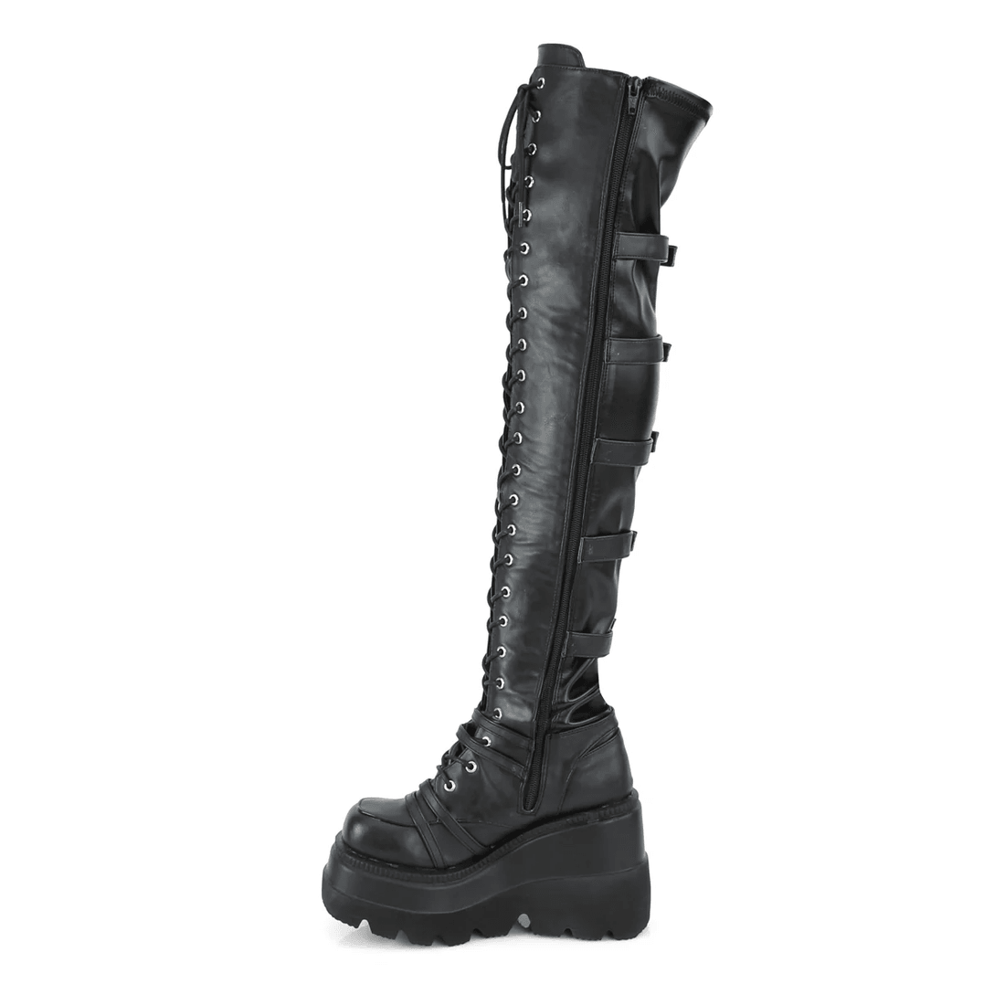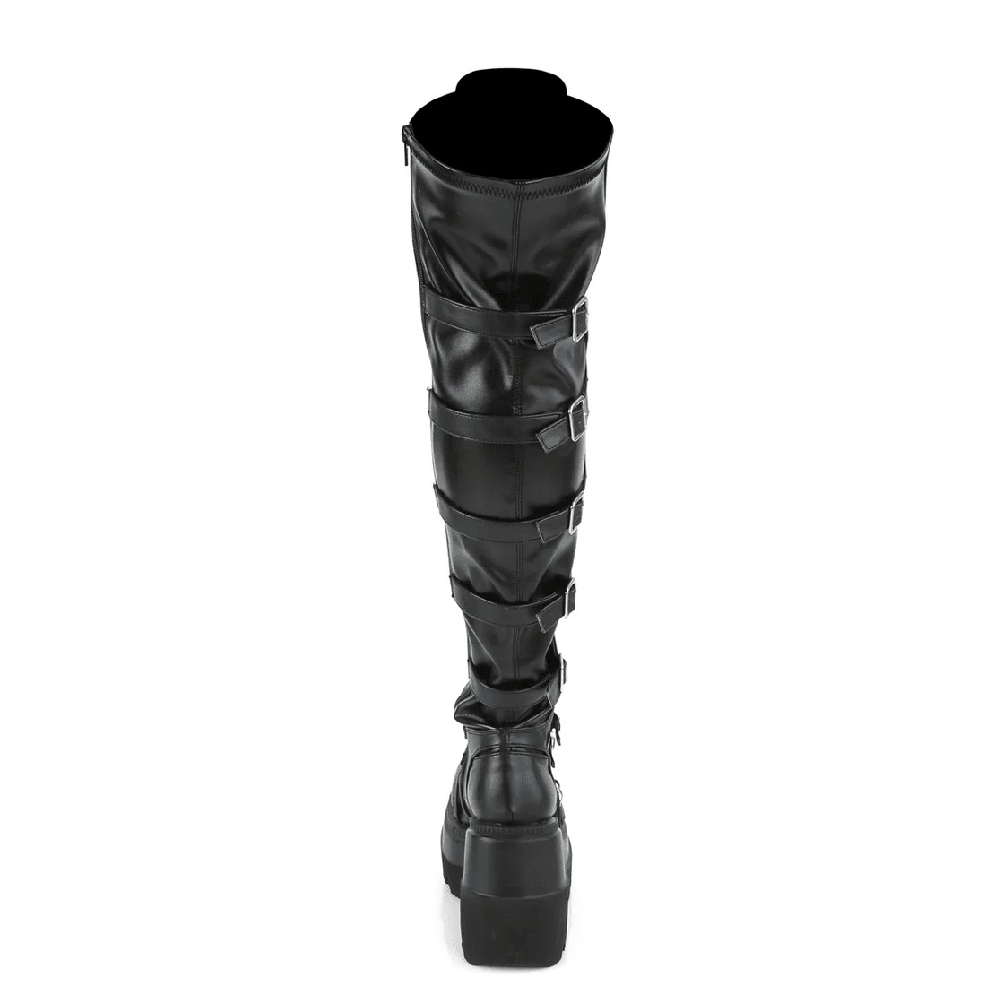 Step into the spotlight with the Demonia Cult Shaker-350 Black Vegan Leather-Stretch boots, designed for the bold and fashion-forward. These stunning over-the-knee boots seamlessly blend high-fashion with high-altitude, ensuring you stand out in any crowd.