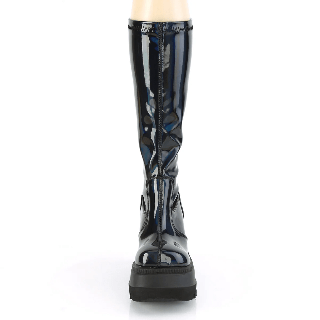 Step into the spotlight with the Demonia Cult Shaker-65 Stretch Black Patent Holo knee-high boot. This striking footwear combines edgy style with comfort, making it a must-have for any fashion-forward individual.