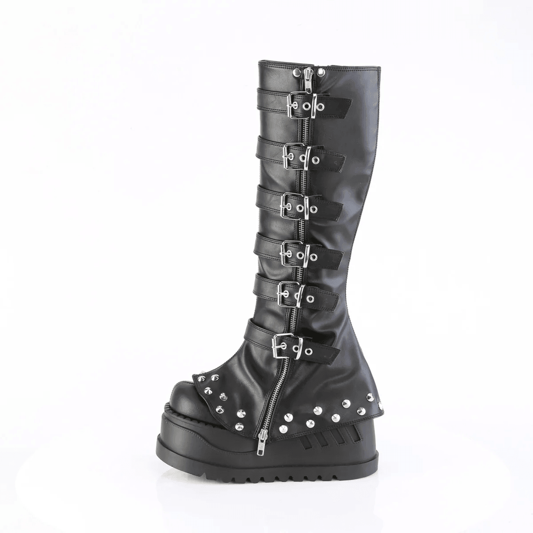 The Demonia Cult Stomp-223 is more than just footwear; it's a bold fashion statement. Crafted from smooth black vegan leather, these boots combine comfort and style seamlessly. The approximate 15" shaft height and 13.2" calf circumference ensure a snug fit, perfect for dancing, strutting, or making a memorable entrance.
