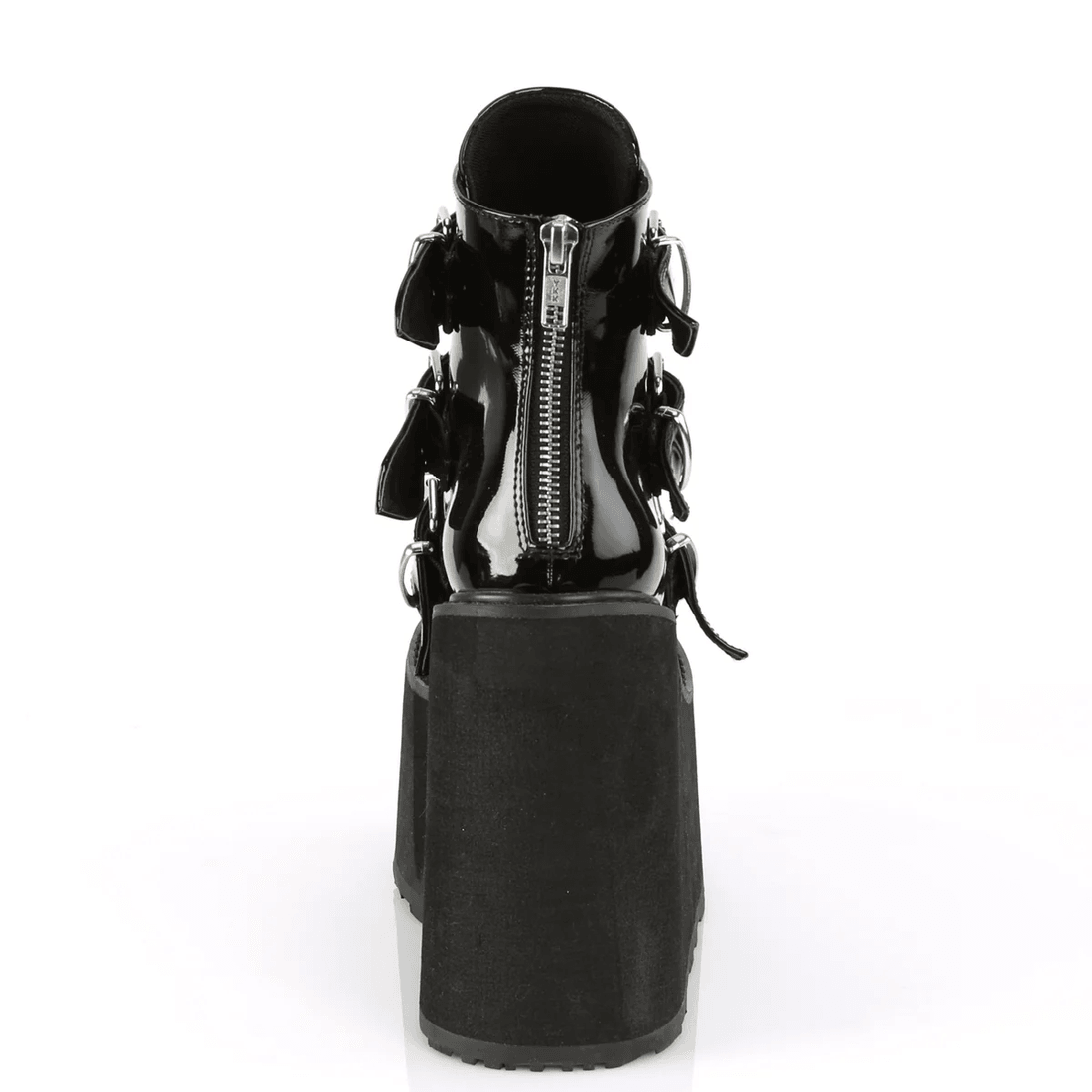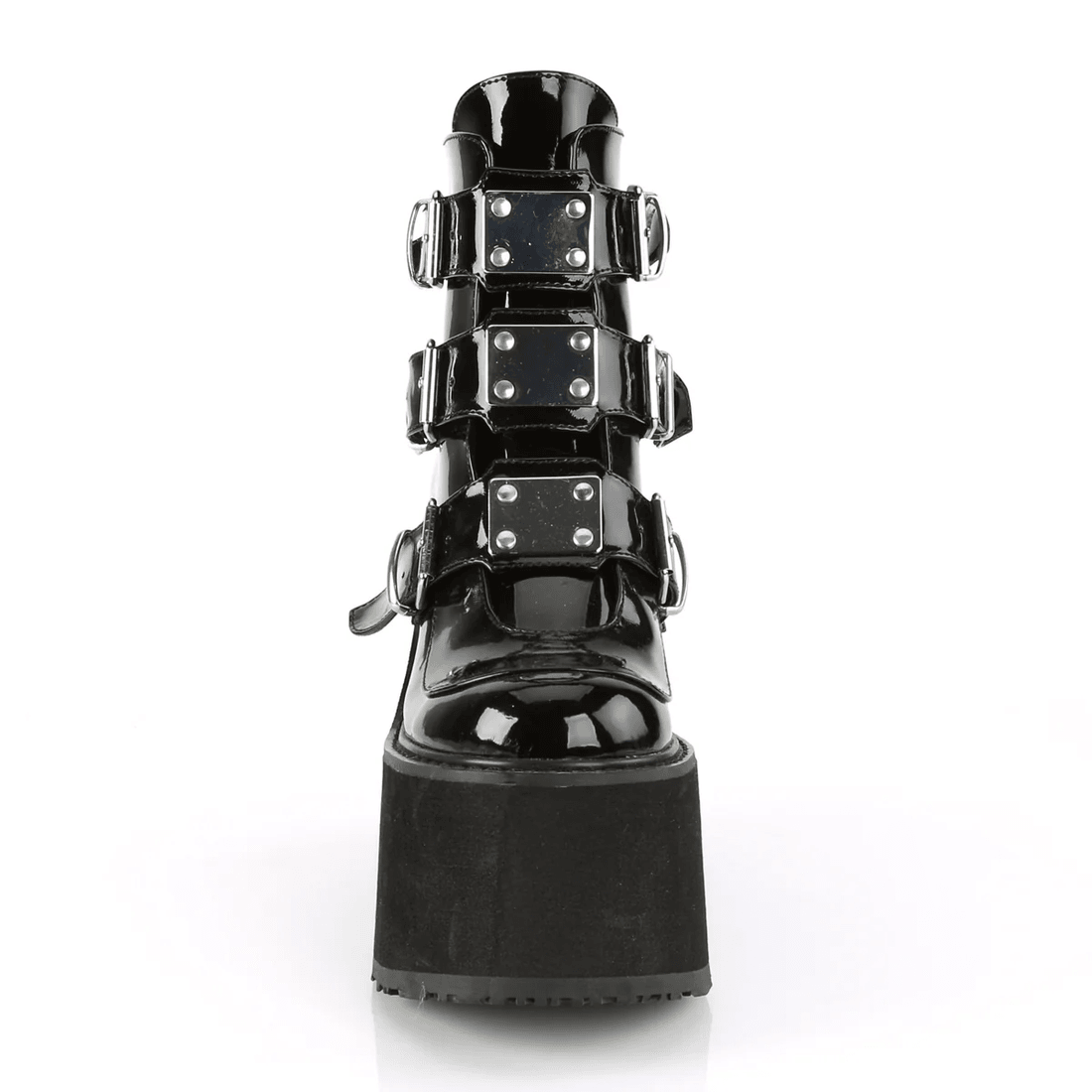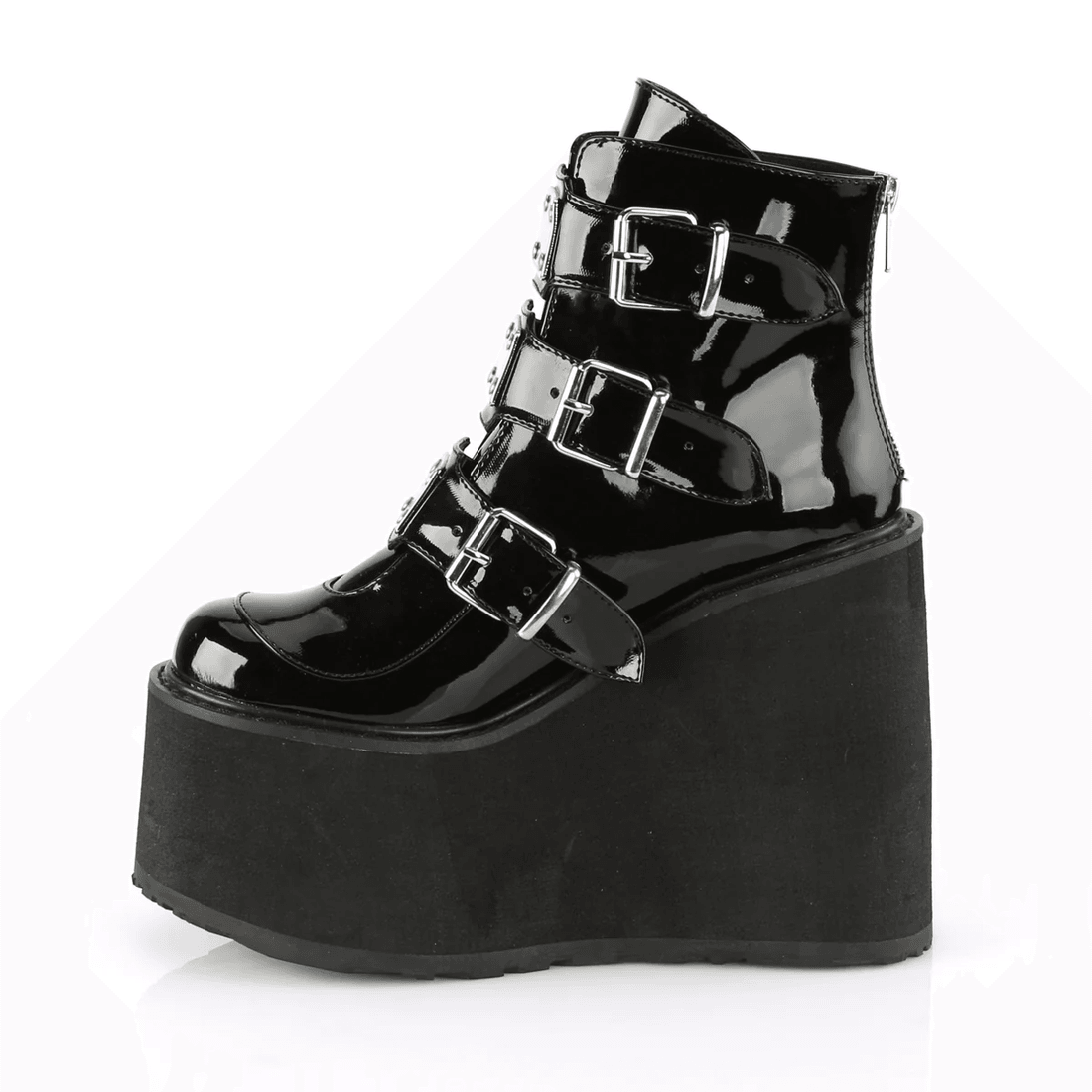 The Demonia Cult Swing-105 Black ankle boots are not just footwear; they are a fashion statement. The striking wedge platform elevates any outfit, making them perfect for both casual outings and nightlife. The triple buckle straps and chrome accents offer a unique touch that sets you apart from the crowd. Crafted for versatility, these boots can complement a range of styles, from punk rock to modern chic.