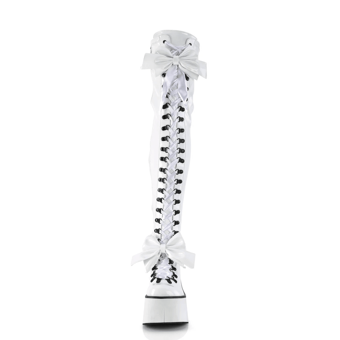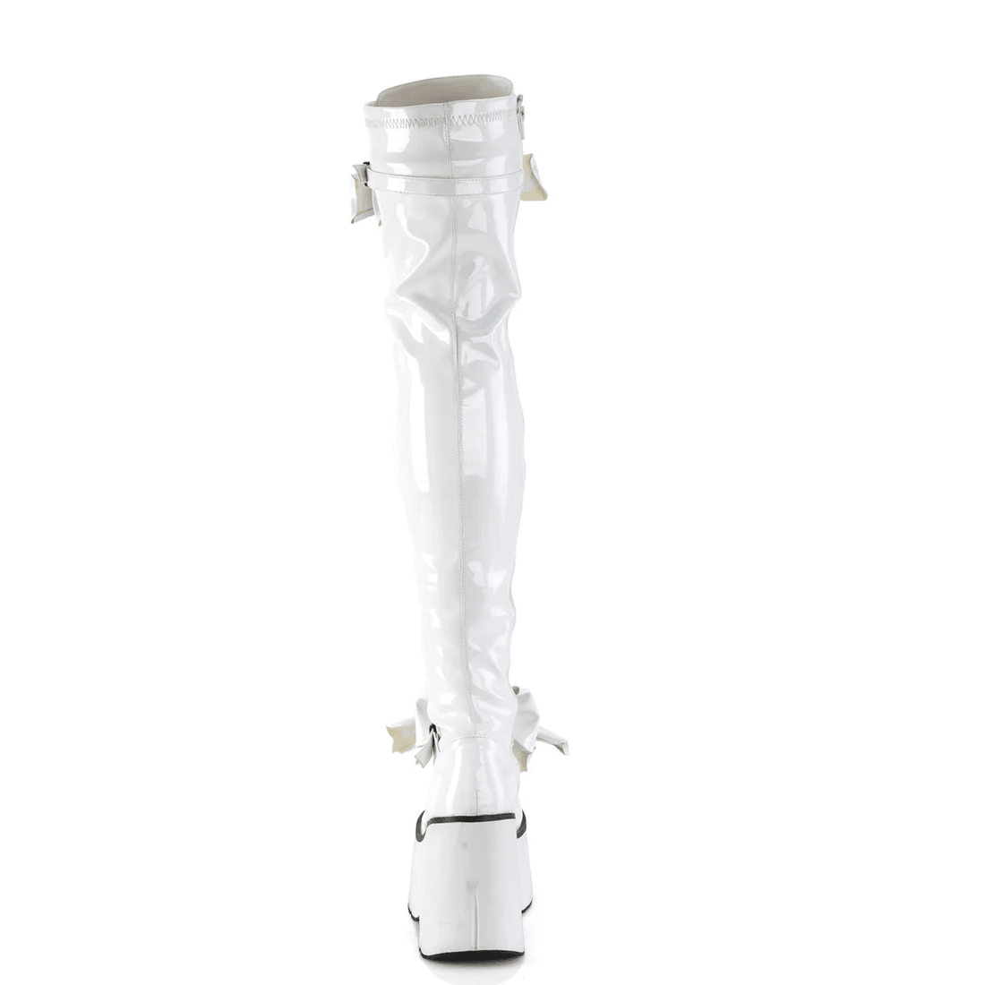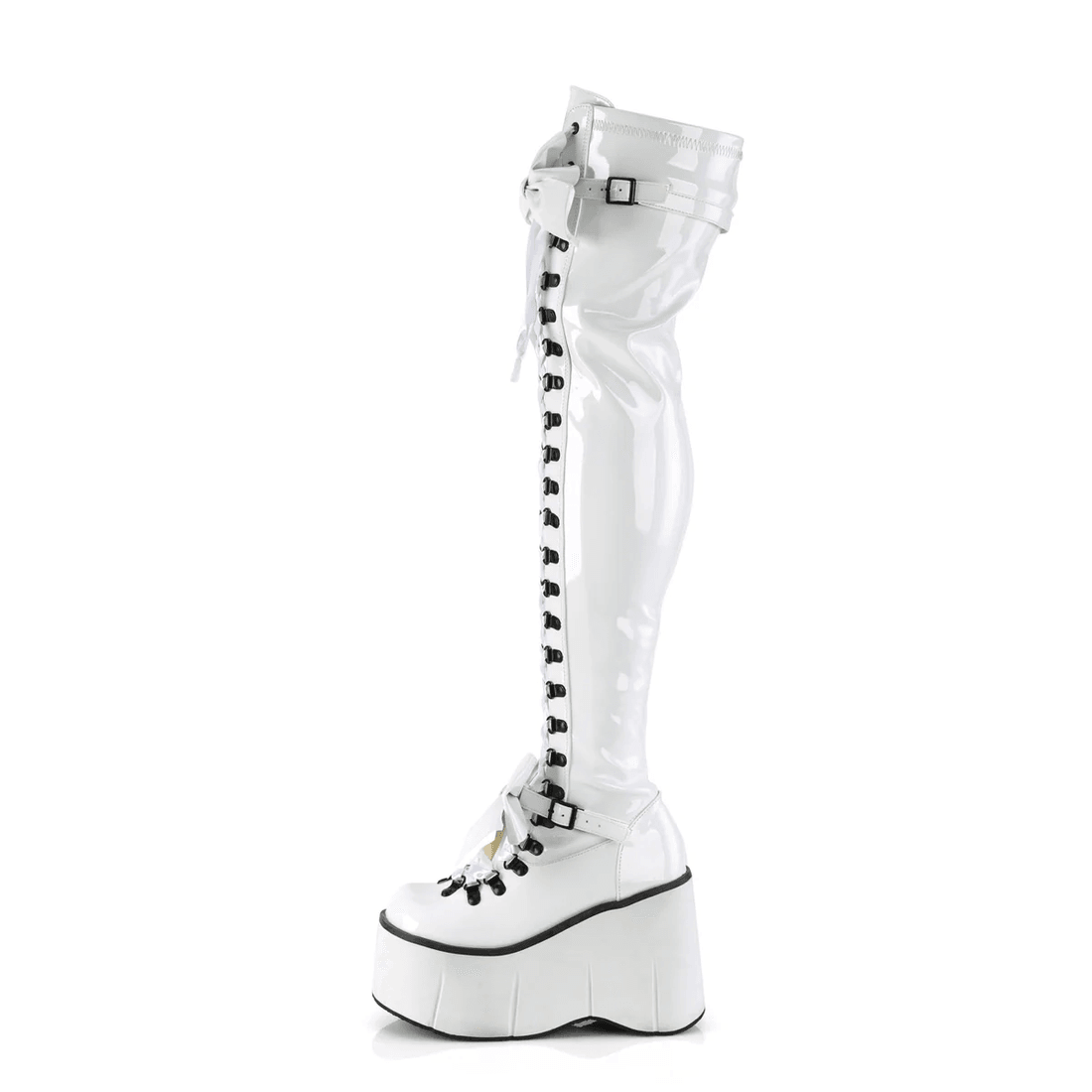 Step into the spotlight with the Demonia Cult Kera-303 White Stretch Patent thigh high boots. Designed for the daring fashionista, these boots elevate any outfit with their striking 4.5" wedge platform and eye-catching white stretch patent material.
