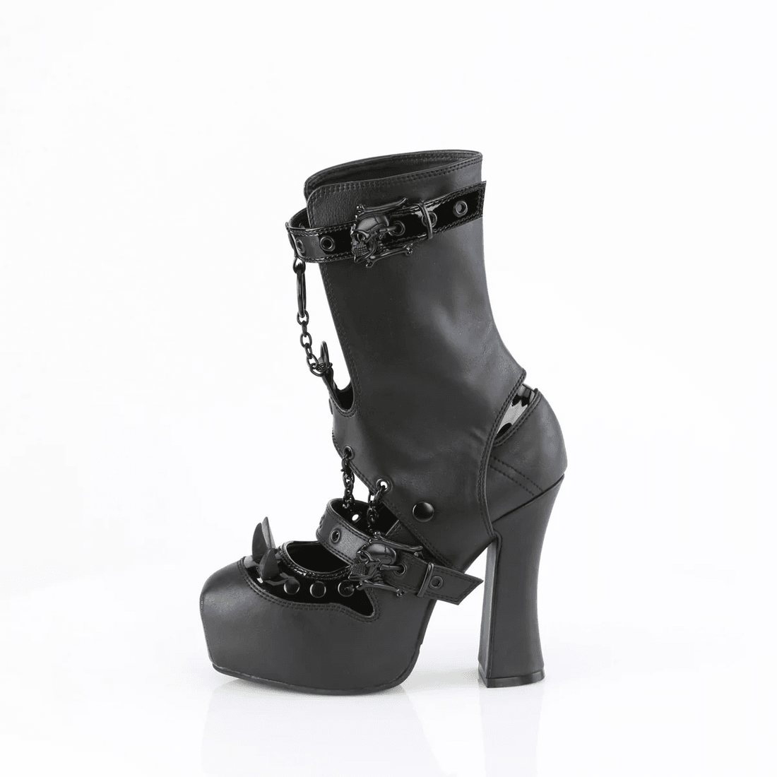 Featuring a spiked skull buckle and a removable cuff adorned with skull and chain details, the Demonia Cult Demon-13 allows you to customize your look in seconds. Whether you're heading to a concert or a night out on the town, these pumps guarantee that all eyes will be on you.