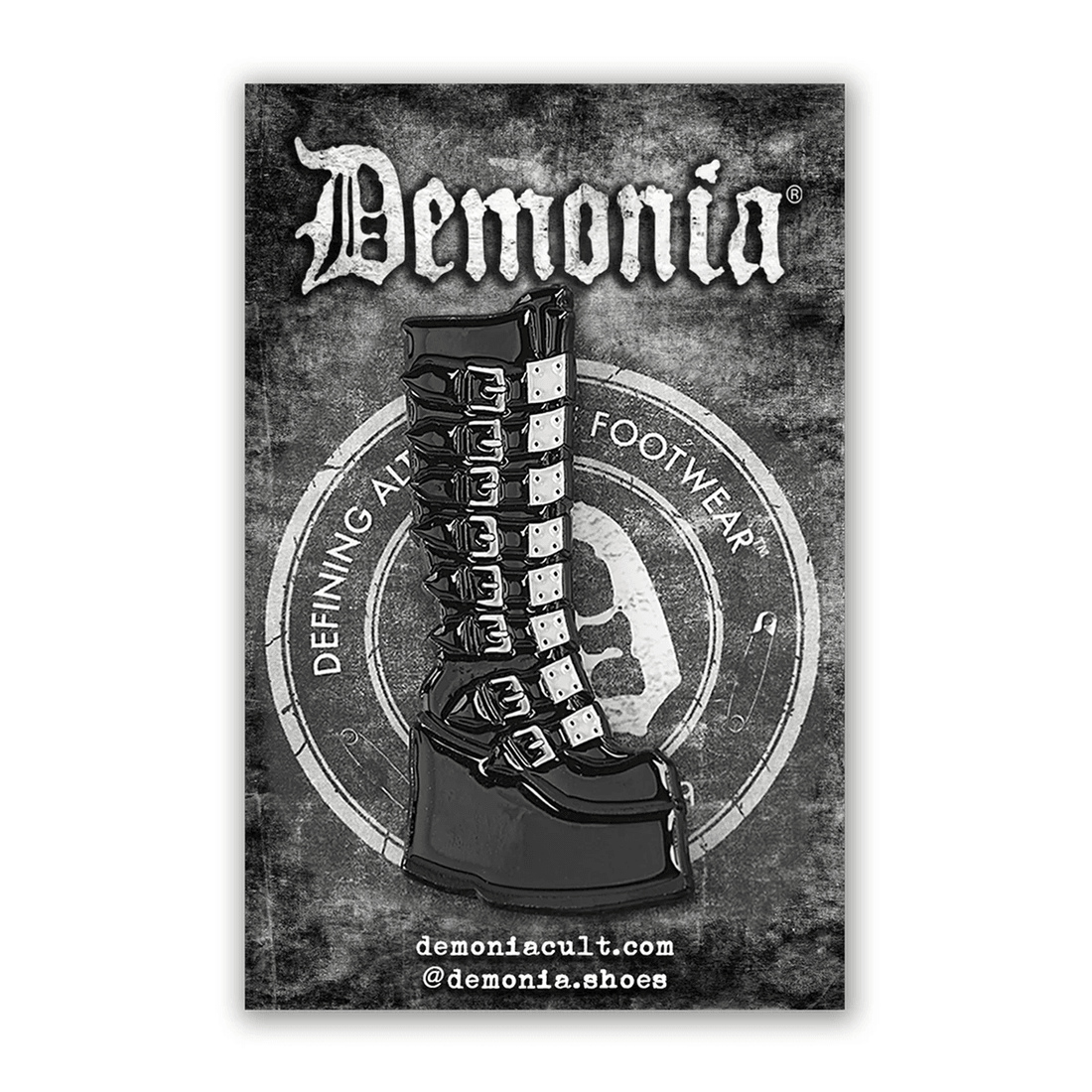 Embrace your alternative style with the striking Demonia Cult Swing-815 Enamel Pin Black. This 2.25" glossy black patent pin perfectly captures the essence of the iconic Swing-815 boot, making it a must-have accessory for fashion enthusiasts and collectors alike.