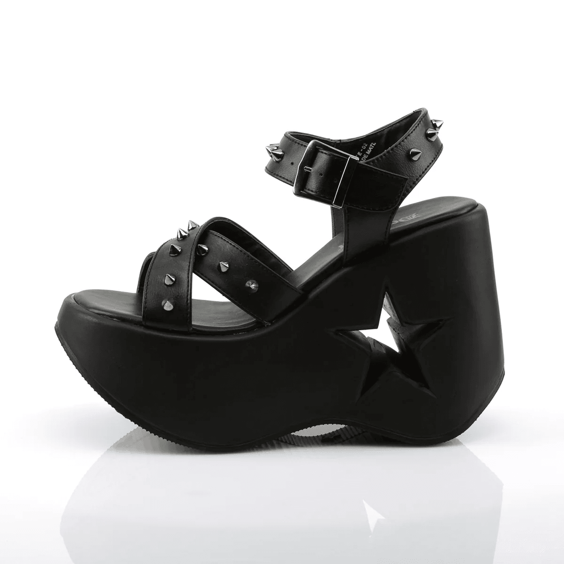 Make a bold fashion statement with the Demonia Cult Dynamite-02 Black Vegan Leather sandals. These stunning ankle strap sandals are designed for those who dare to stand out. Featuring a unique 5" star cutout platform, these shoes effortlessly combine style and comfort.
