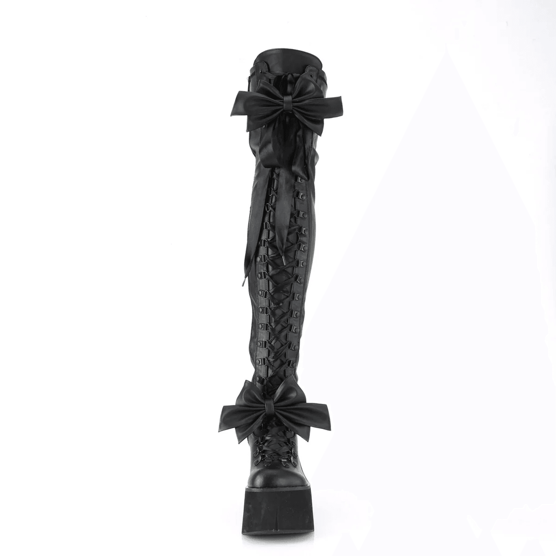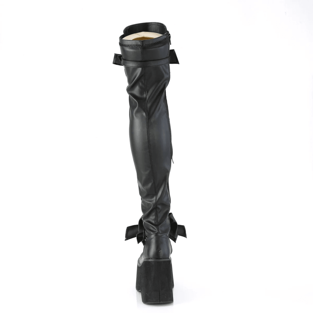 The Demonia Cult Kera-303 boots feature a stunning silhouette that hugs your legs, making them ideal for both edgy outfits and chic ensembles. With an approximate calf circumference of 15" and a shaft height of 24", these thigh-high boots are designed to flatter all leg shapes. The combination of the sleek vegan leather and the stylish bows allows for a versatile look that can be tailored to your unique style.