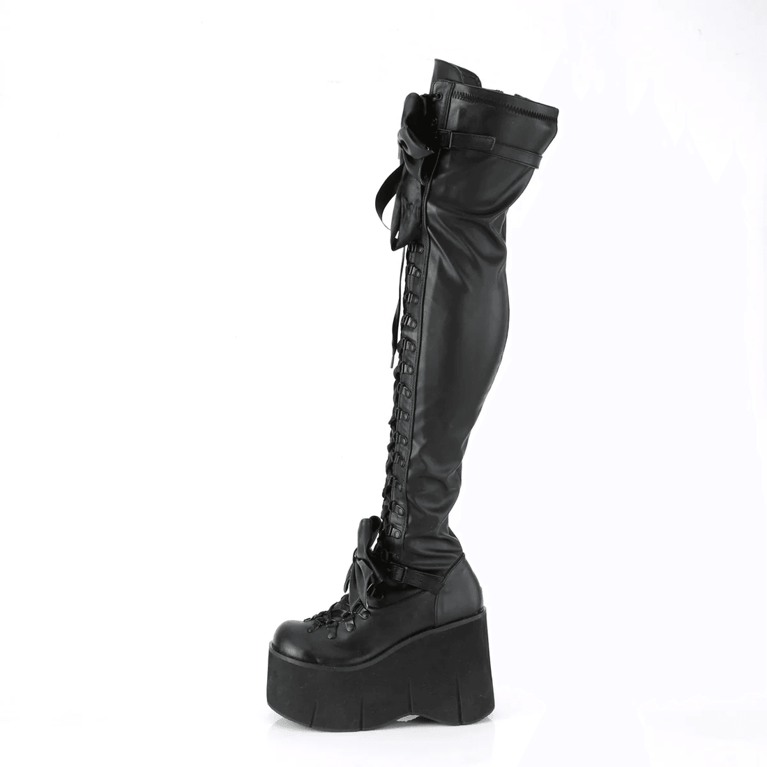 Step into the spotlight with the bold and captivating Demonia Cult Kera-303 Black Stretch Vegan Leather thigh-high boots. Designed for those who dare to express their individuality, these boots combine fashion-forward style with ethical materials.
