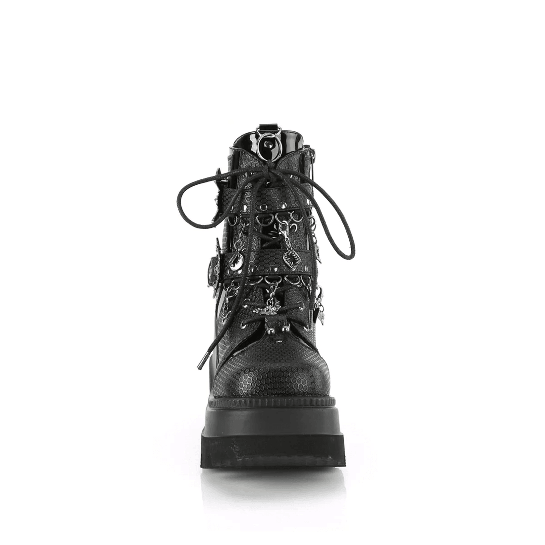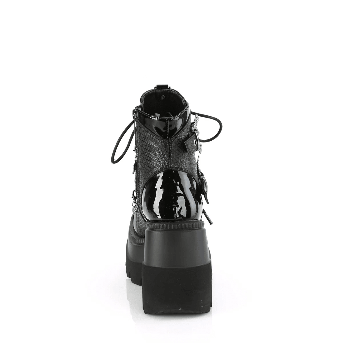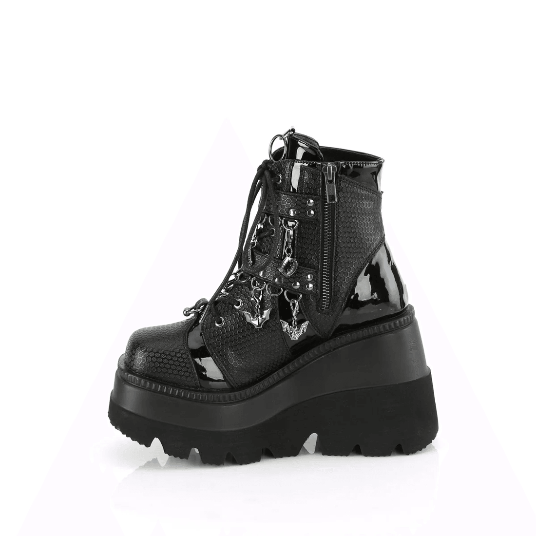 Step into the spotlight with the Demonia Cult Shaker-66 Black Vegan Leather ankle boots. Designed for the bold, these stunning boots feature a striking 4 1/2" wedge platform that elevates your style and commands attention. Whether you're hitting the town or making a statement at a festival, these boots are your perfect companion.