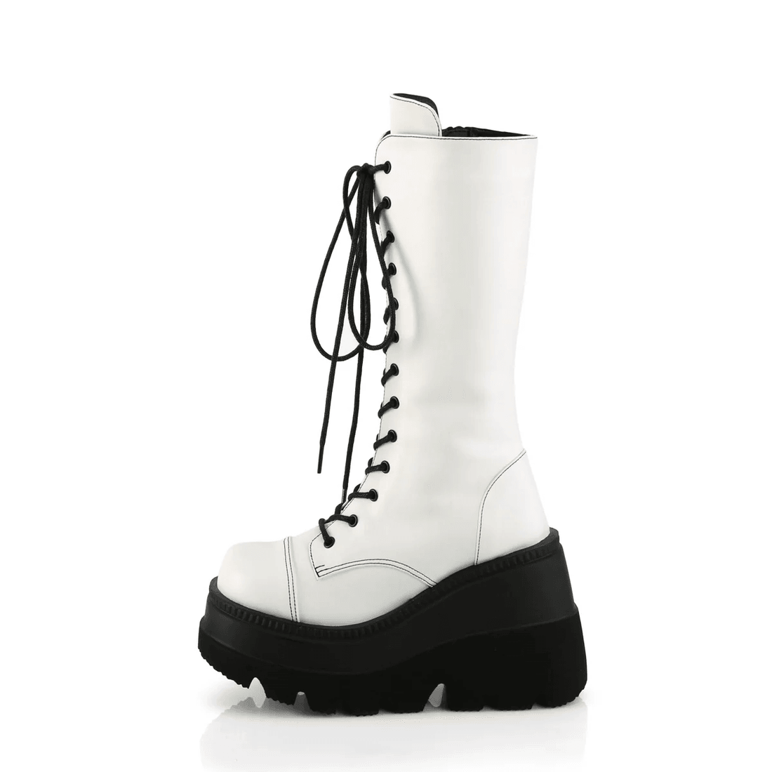 The Demonia Cult Shaker-72 boots redefine modern footwear with their striking 4 1/2" wedge platform and daring lace-up front. With an approximate calf circumference of 11.8" and a shaft height of 11", these boots promise a flattering fit that accentuates your legs. The sleek white vegan leather not only looks great but also aligns with eco-conscious choices.