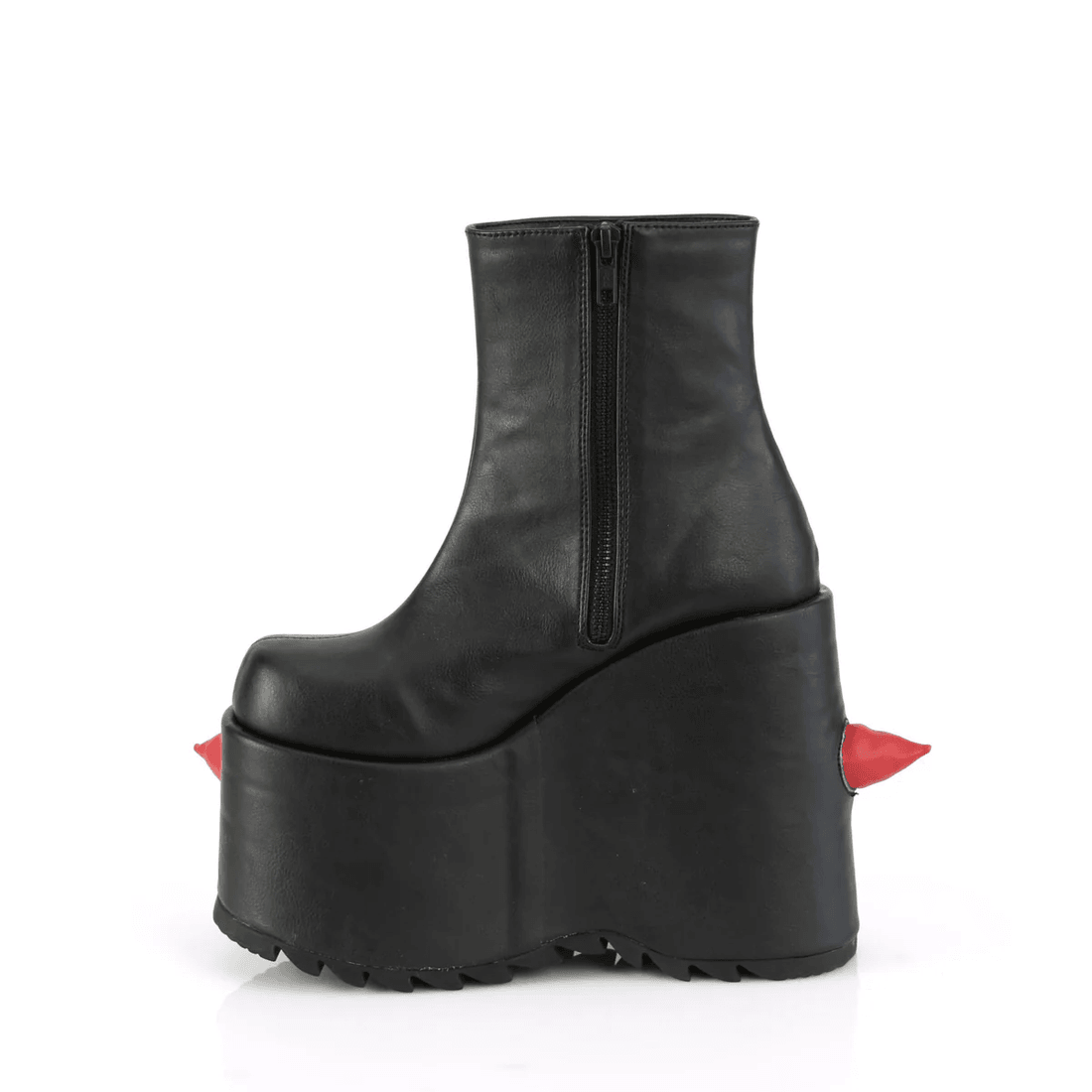 Step into a world of bold fashion with the Demonia Cult Slay-77 Black-Red Vegan Leather ankle boots. These striking 7" wedge platforms are designed for those who dare to stand out and make a statement. Crafted from high-quality vegan leather, these boots blend style with a commitment to sustainability.