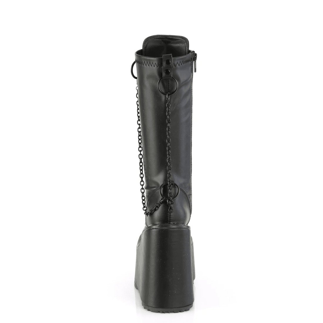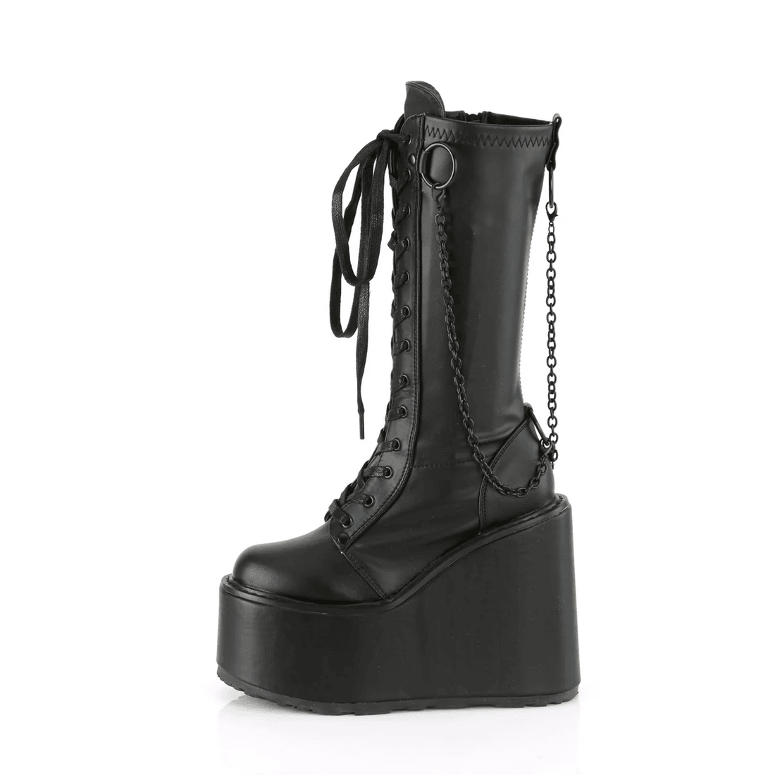 The Demonia Cult Swing-150 Black Stretch Vegan Leather boots are the perfect blend of edgy fashion and everyday practicality. Crafted from high-quality black stretch vegan leather, these boots hug your legs for an enviable silhouette. The impressive 5 1/2" wedge platform not only enhances your height but also provides stability and comfort, making them ideal for any occasion.