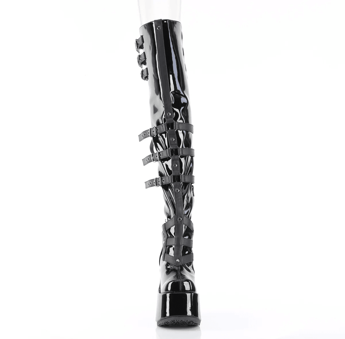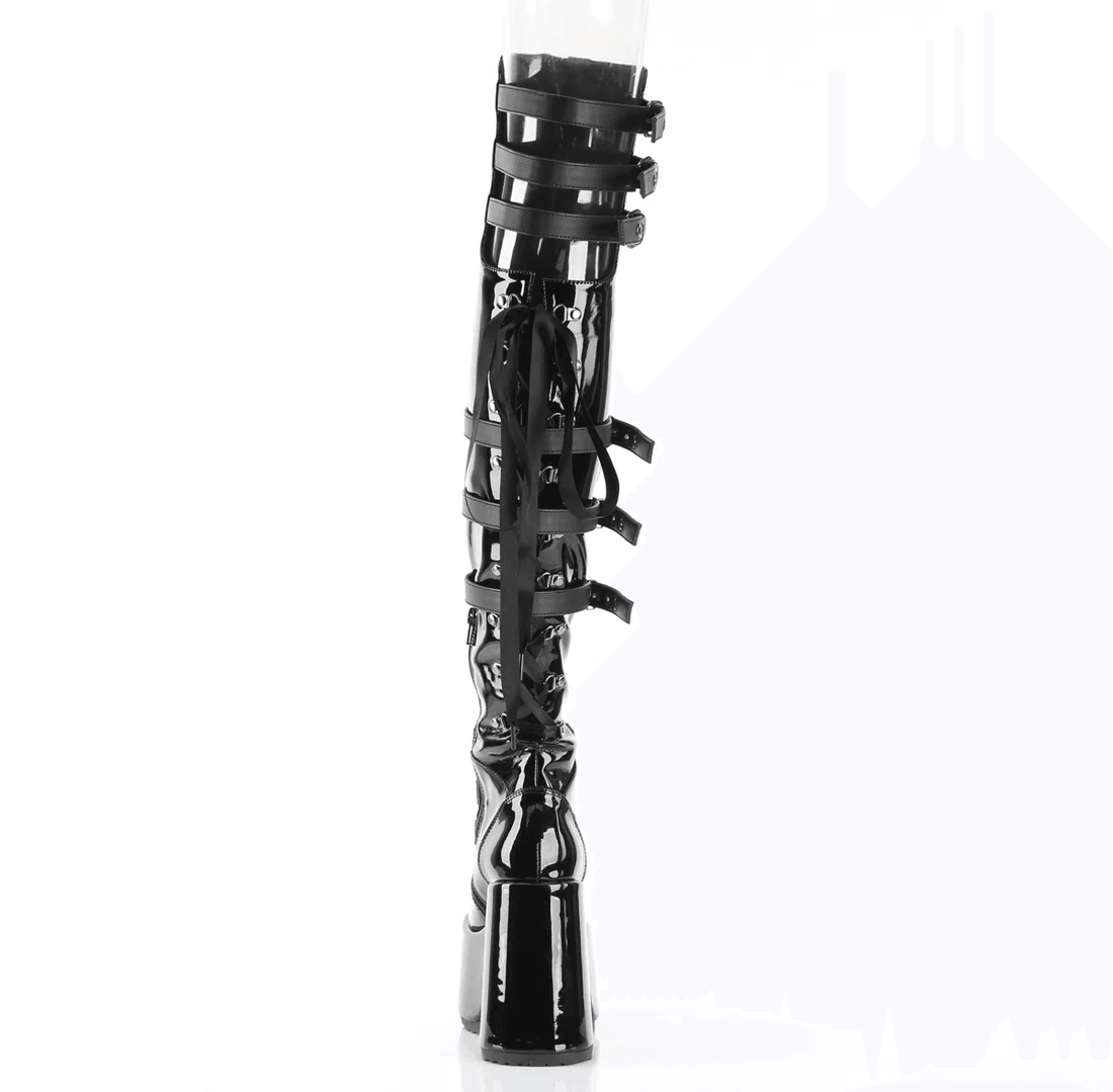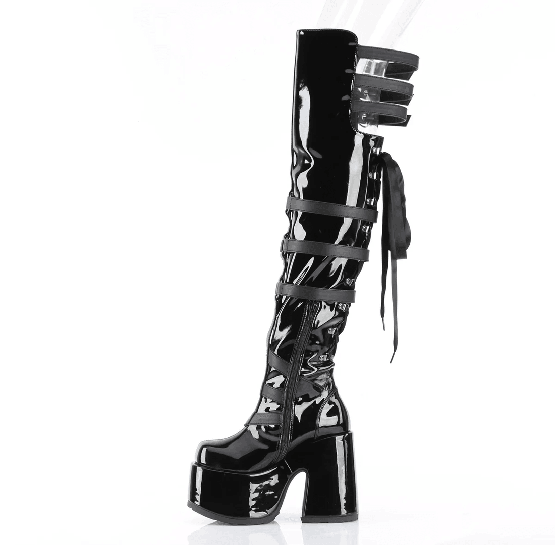 Step into the spotlight with the Demonia Cult Camel-308 Black Patent thigh-high boots. Designed for those who dare to stand out, these boots combine edgy style with ultimate comfort. With a striking 5" chunky heel and a bold 3" platform, they are the perfect accessory for any daring outfit.