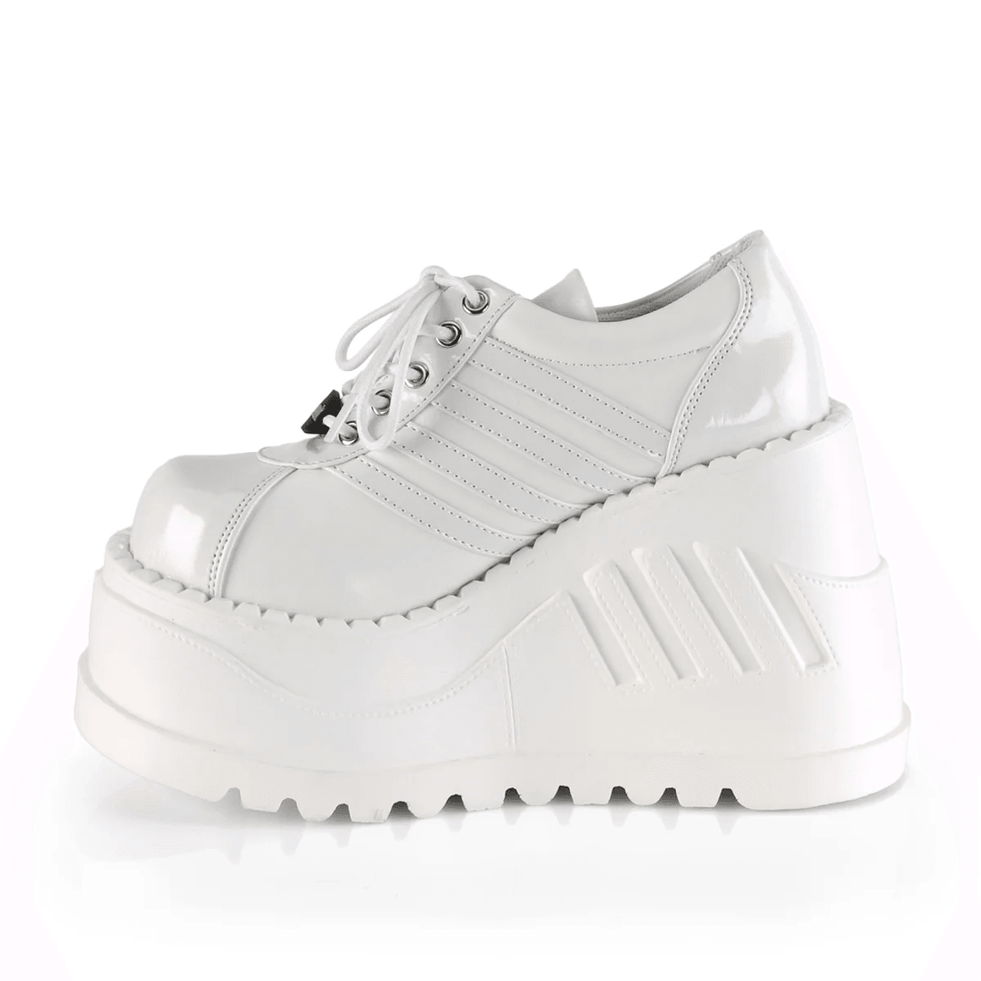 Step into the spotlight with the Demonia Cult Stomp-08 White Patent-Vegan Leather, a stunning pair of lace-up oxford shoes designed for those who dare to stand out. With a remarkable 4 3/4" wedge platform, these shoes offer a bold lift while ensuring comfort and style.