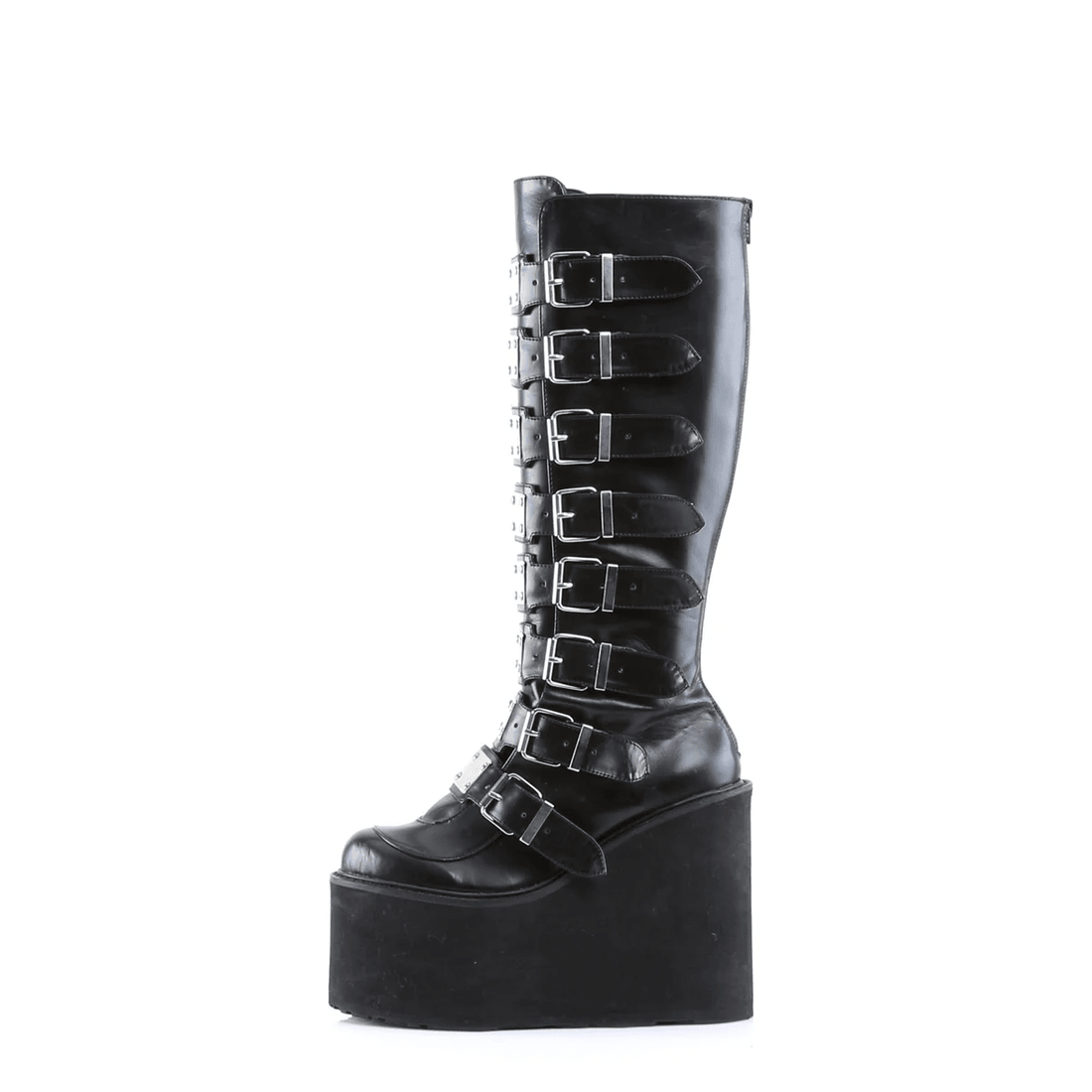 demonia Cult Swing-815 Mustat Vegaaninnahkabootsit Ovat Enemmän Kuin Pelkät Jalkineet; Ne Ovat Lausunto. Täydelliset Konserteille, Yöelämään Tai Ainutlaatuisen Sävyn Lisäämiseen Jokapäiväiseen Ilmeeseesi, Nämä Polvenkorkuiset Bootsit Kääntävät Katseita. Klassisen Mustan Vegaaninnahkan Ja Teollisten Metallikoristeiden Yhdistelmä Tekee Niistä Monikäyttöiset Mihin Tahansa Tilaisuuteen.