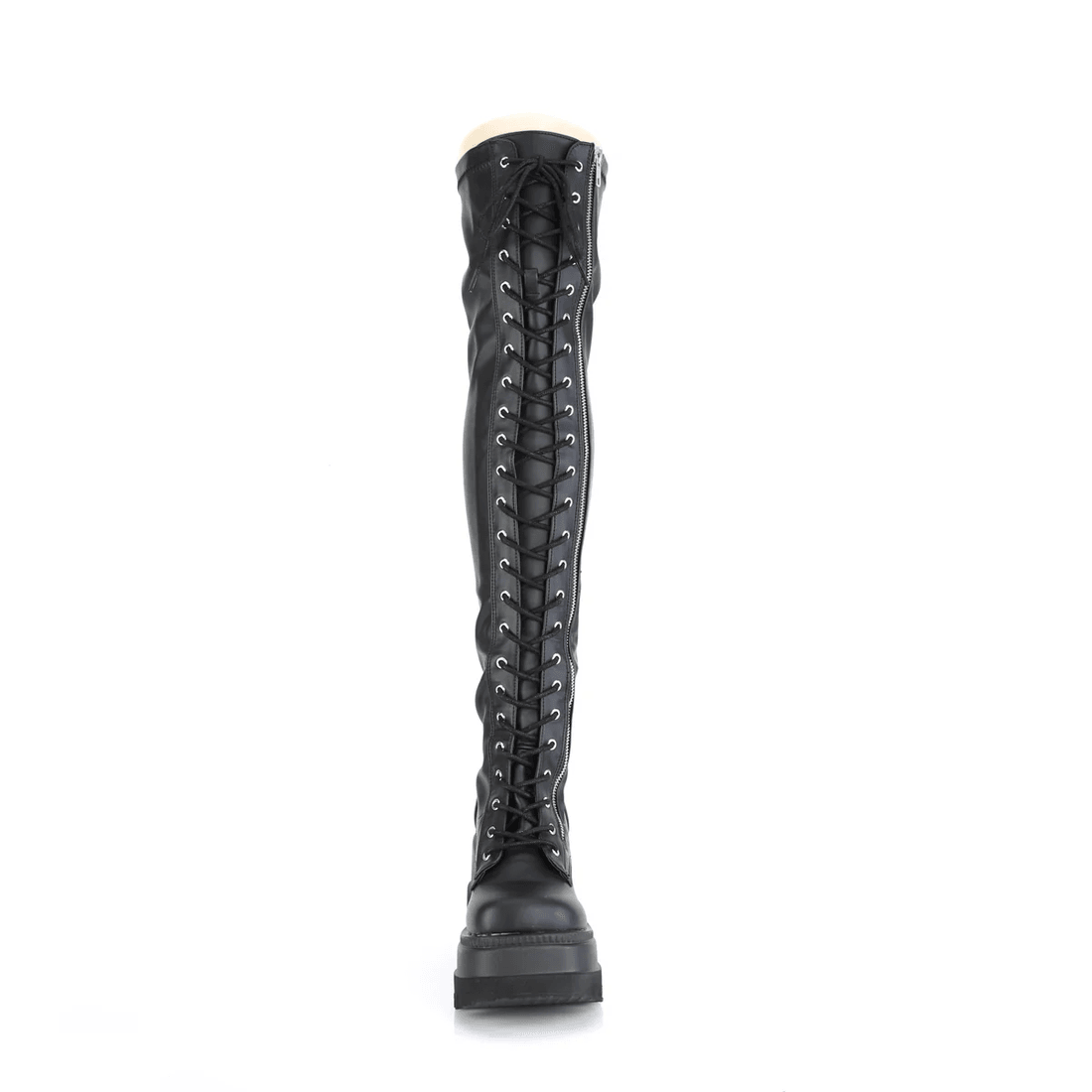 Elevate your fashion game with the Demonia Cult Shaker-374 Black Str. Vegan Leather thigh-high boots. Designed for those who dare to stand out, these striking boots combine comfort and edgy style in one perfect package.