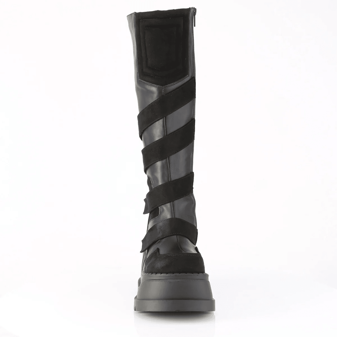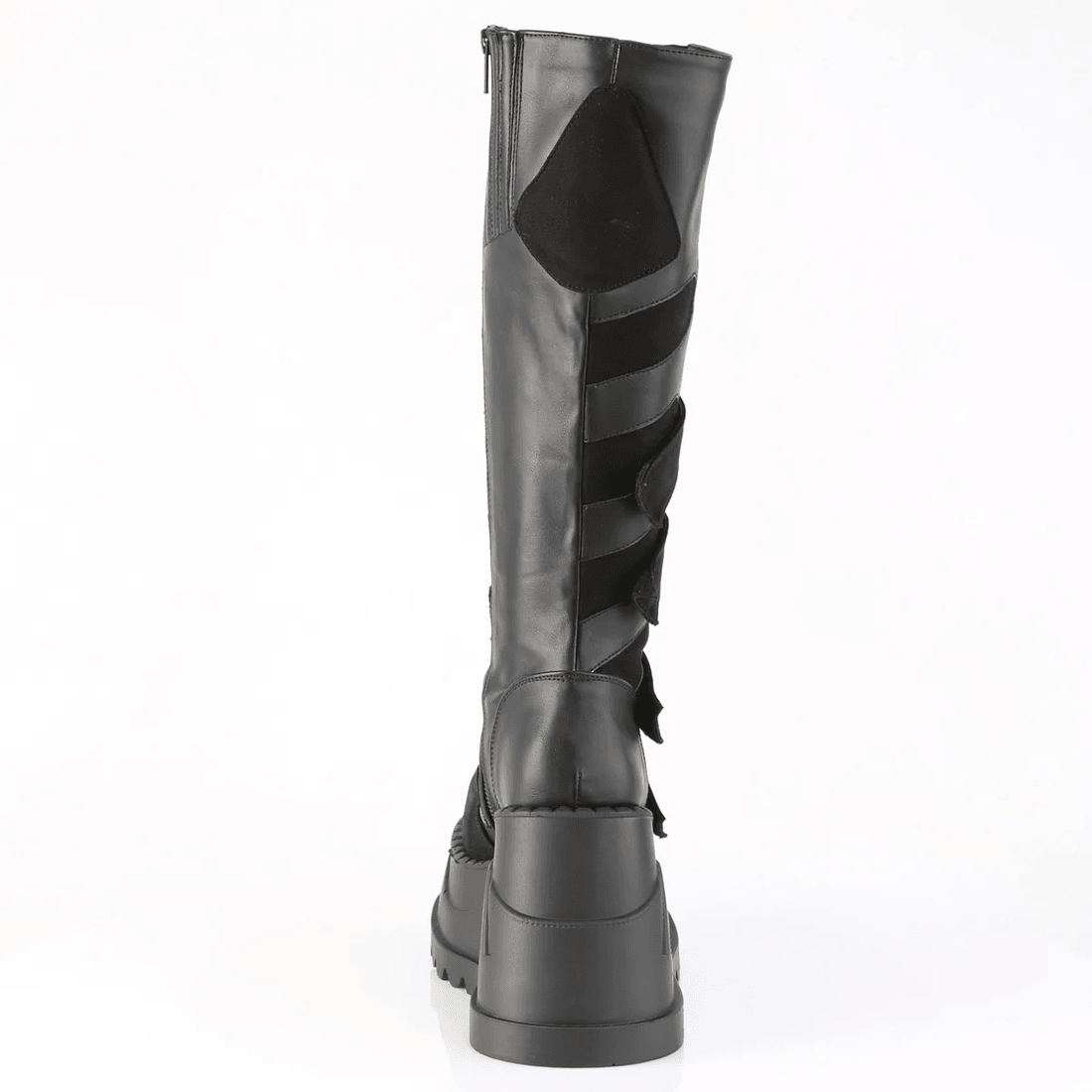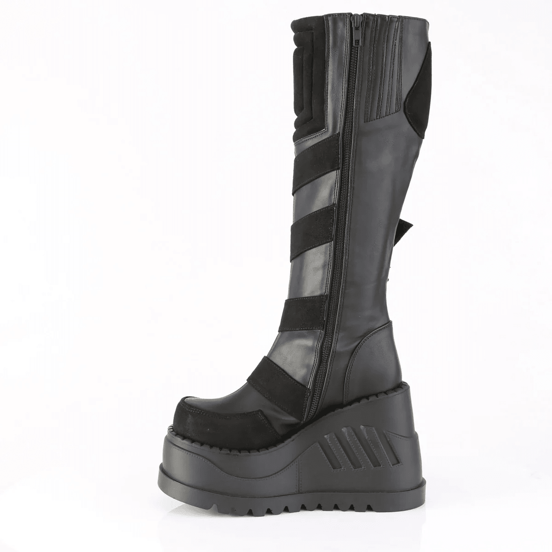 Step into the future with the Demonia Cult Stomp-228 Black Vegan Leather boots. Designed for the bold and daring, these knee-high boots feature a striking 4 3/4" wedge platform that combines sleek aesthetics with a commanding presence.
