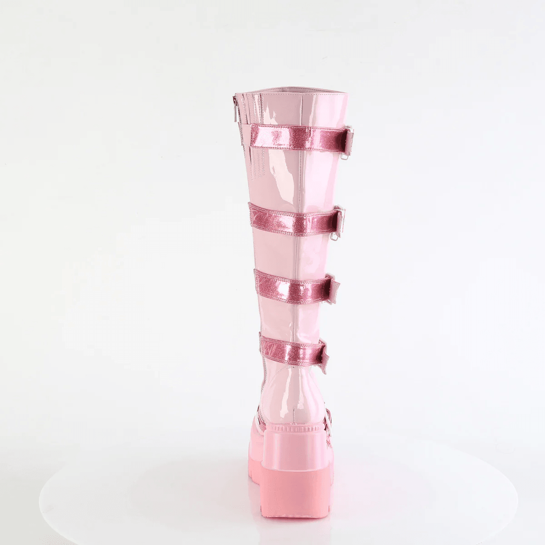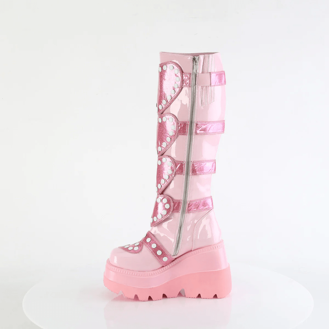 The Demonia Cult Shaker-210 Baby Pink Patent boots are designed for those who dare to express their unique style. Standing tall on a sturdy 4 1/2" wedge platform, these knee-high boots are perfect for making a statement. The combination of the striking baby pink patent finish and the playful buckled heart shield, adorned with round studded details, ensures all eyes will be on you.