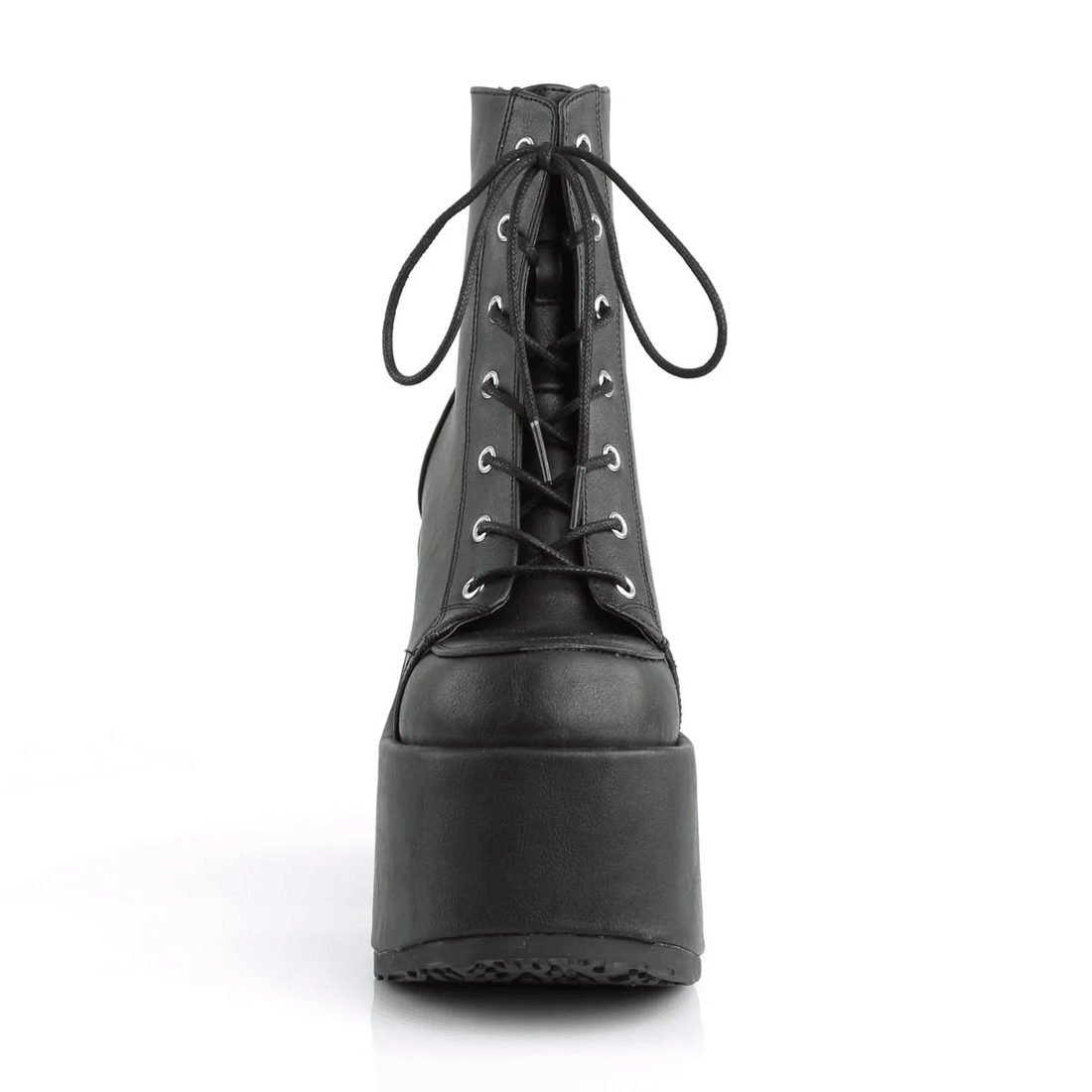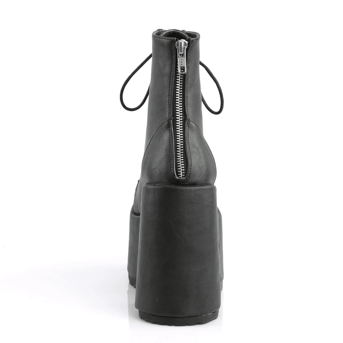 fai Il Tuo Ingresso Sotto I Riflettori Con Gli stivali Alla Caviglia In Pelle Vegana Nera Demonia Cult Camel-203, Progettati Per Coloro Che Osano Distinguersi. Con Un Sorprendente Tacco Chunky Di 5" E Una Piattaforma Audace Di 3", Questi Stivali Sono La Fusione Definitiva Di Stile E Comfort.