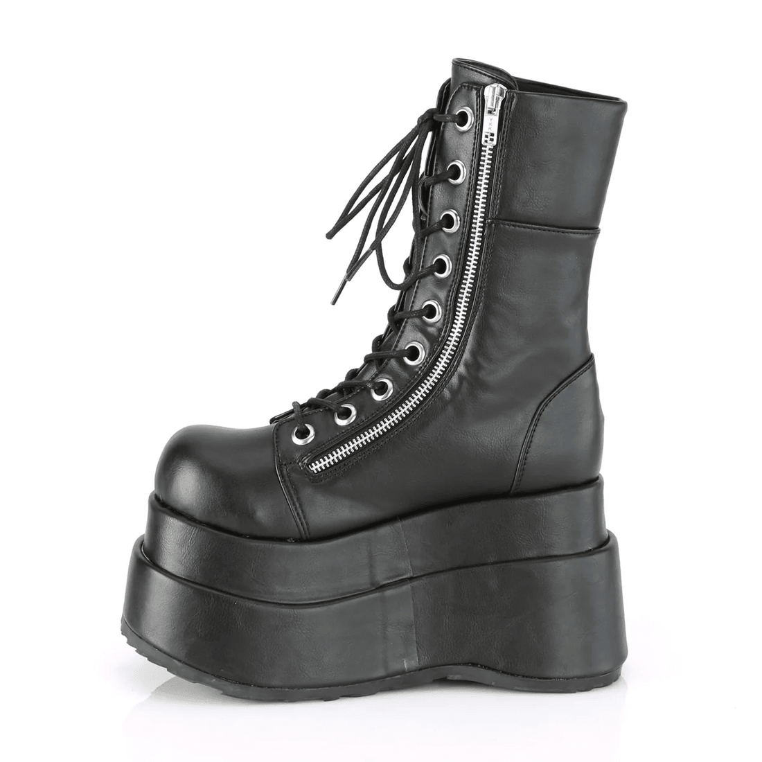 デモニアカルトベア-265ブーツは、大胆で恐れを知らない人のためにデザインされています。ユニークな4 1/2インチのティアードプラットフォームを備えたこのミッドカーフブーツは、主張をするための完璧な高さを提供します。クルエルティフリーのブラックヴィーガンレザーは、見た目が素晴らしいだけでなく、あなたの倫理的価値観にも合致します。