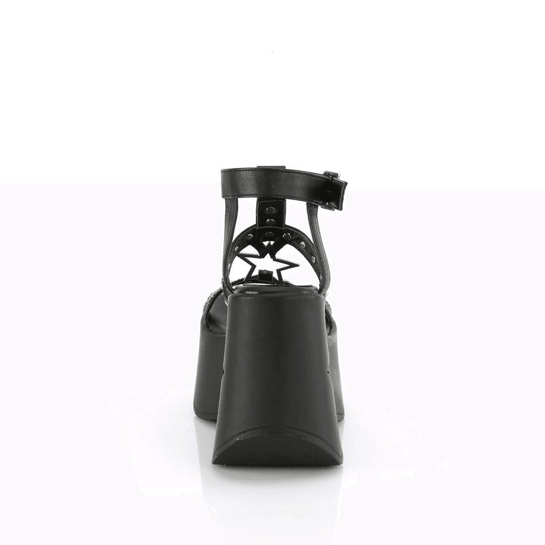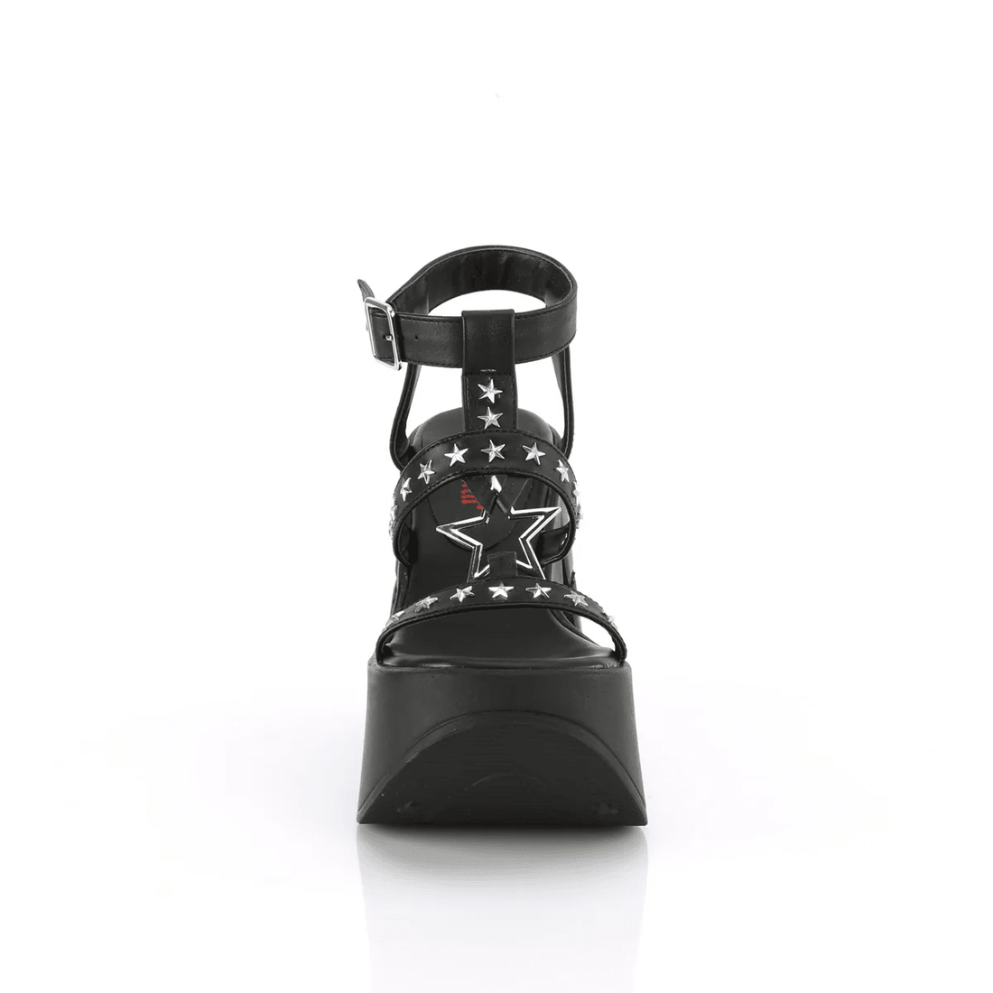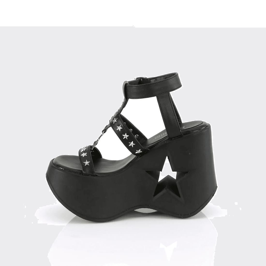 The Demonia Cult Dynamite-12 features a unique star cutout design that elevates your look, both literally and figuratively. The striking 5-inch platform wedge is wrapped in luxurious black vegan leather, ensuring comfort without compromising style. With a wrap-around ankle strap and strappy details, these sandals provide a secure fit while showcasing your individuality.