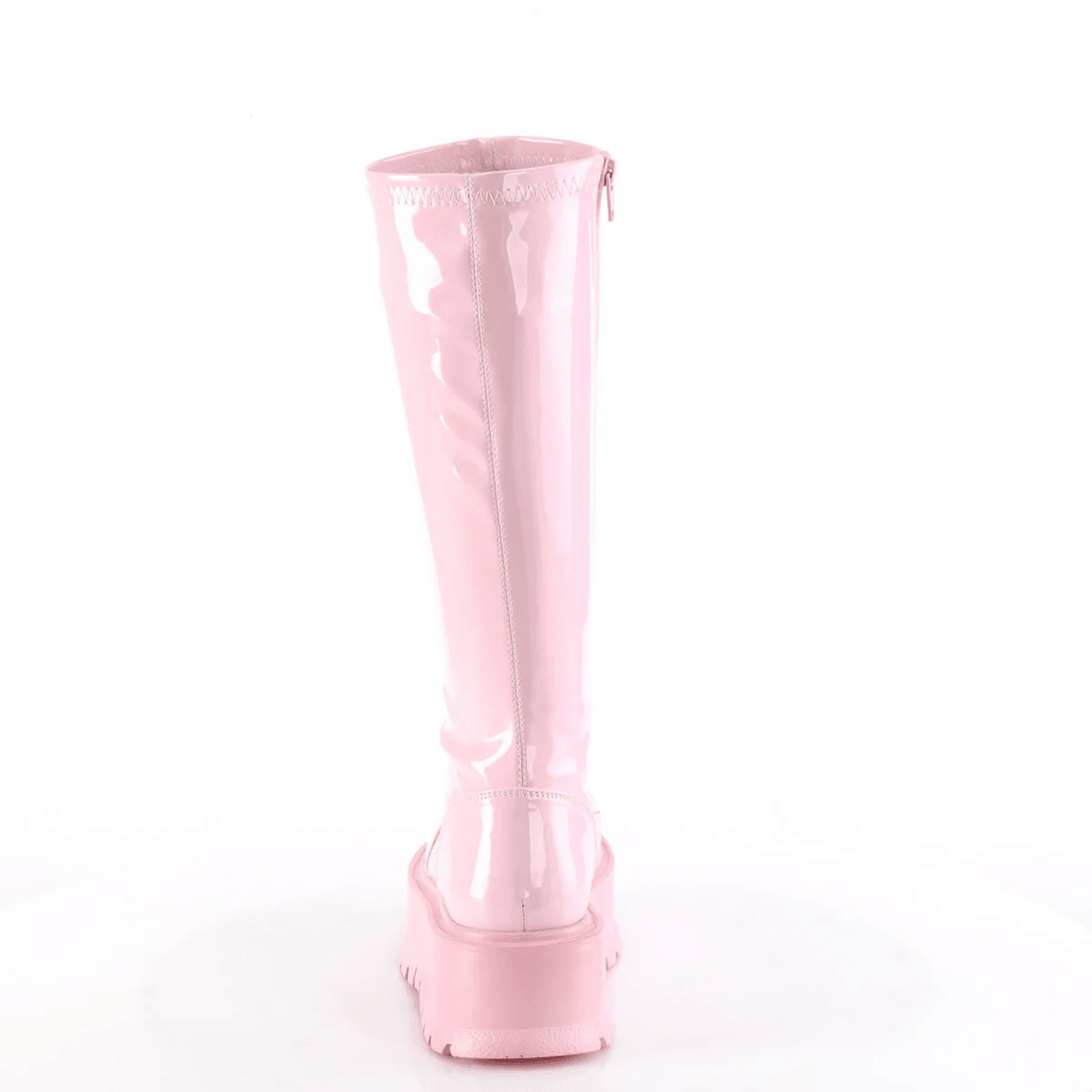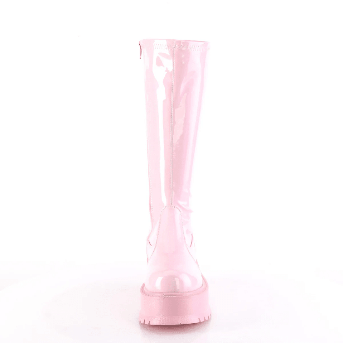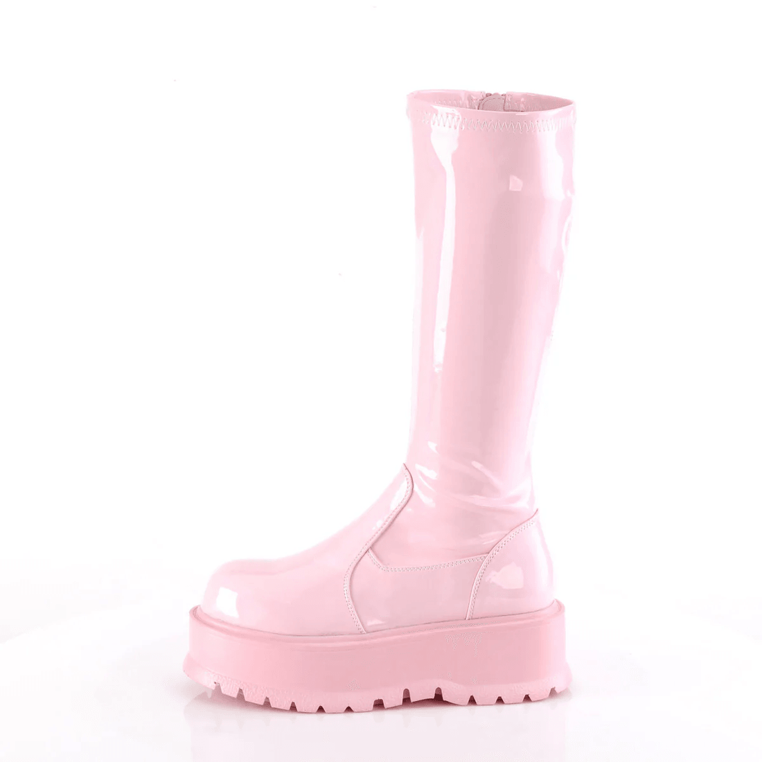 Discover the Demonia Cult Slacker-200 Baby Pink Holo Patent Boots